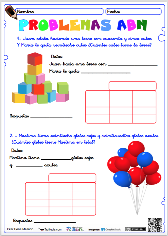 Pilar Peña Mellado maestra de Primero de Primaria en el CEIP «Alonso de Aguilar» en Aguilar de la Frontera en Córdoba nos remite una ficha en la cual se trabaja un problema de restar de categoría «cambio 2» y otro de sumar de «cambio 1» de una sola operación para trabajar con el formato ABN y disponible tambien para el algoritmo tradicional.