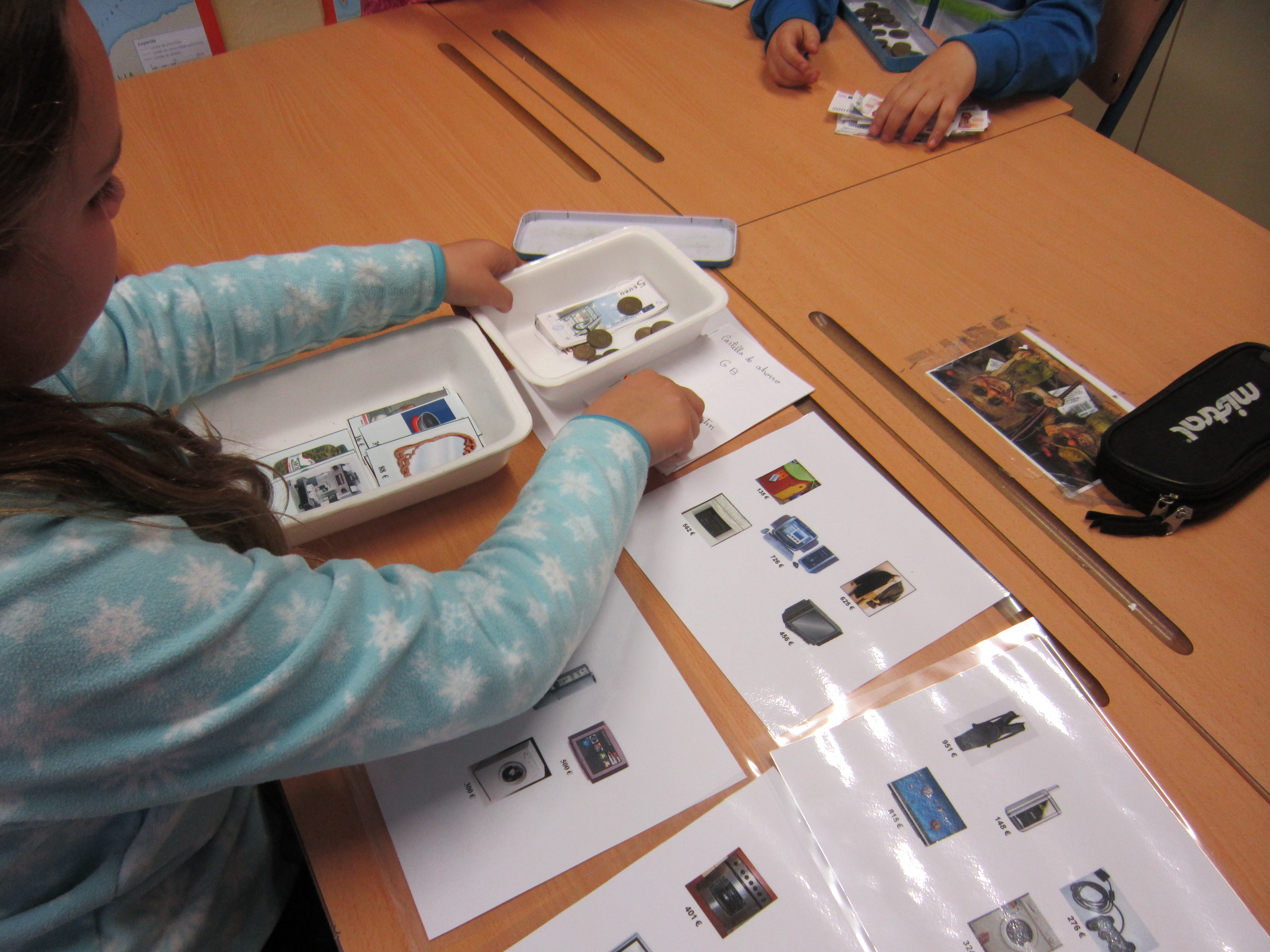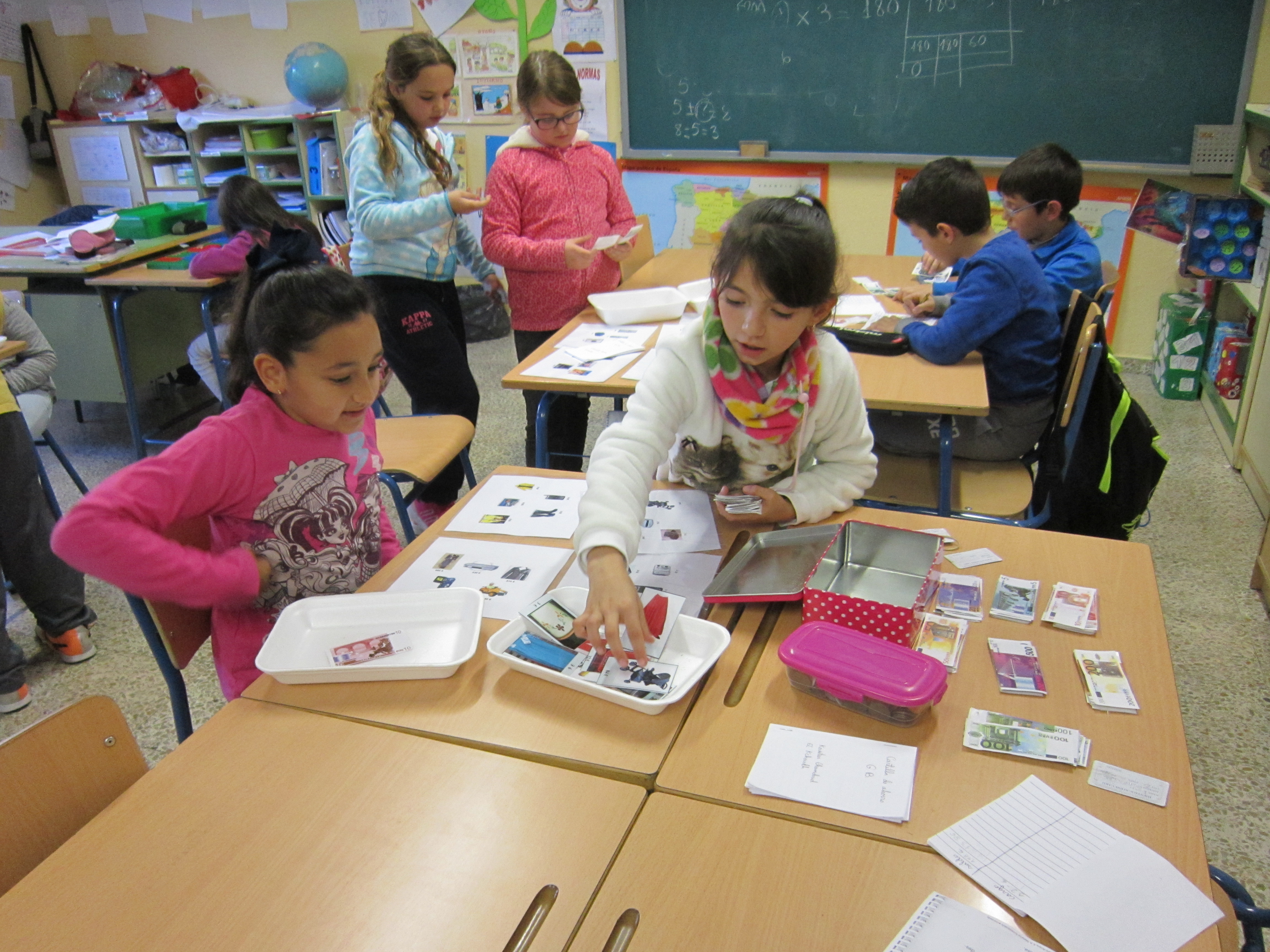 Esta actividad la empezó a trabajar en 2º de Primaria, si bien se podría empezar desde 1º y continuar hasta 3º y que realiza los viernes y con la cual el alumnado está muy motivado, y aunque hacen cálculos y mas cálculos no les resulta para nada penoso, sino al contrario, la reclaman. Para ello se trabaja con equipos formados por: un banquero/a, un tendero/a y dos compradores.