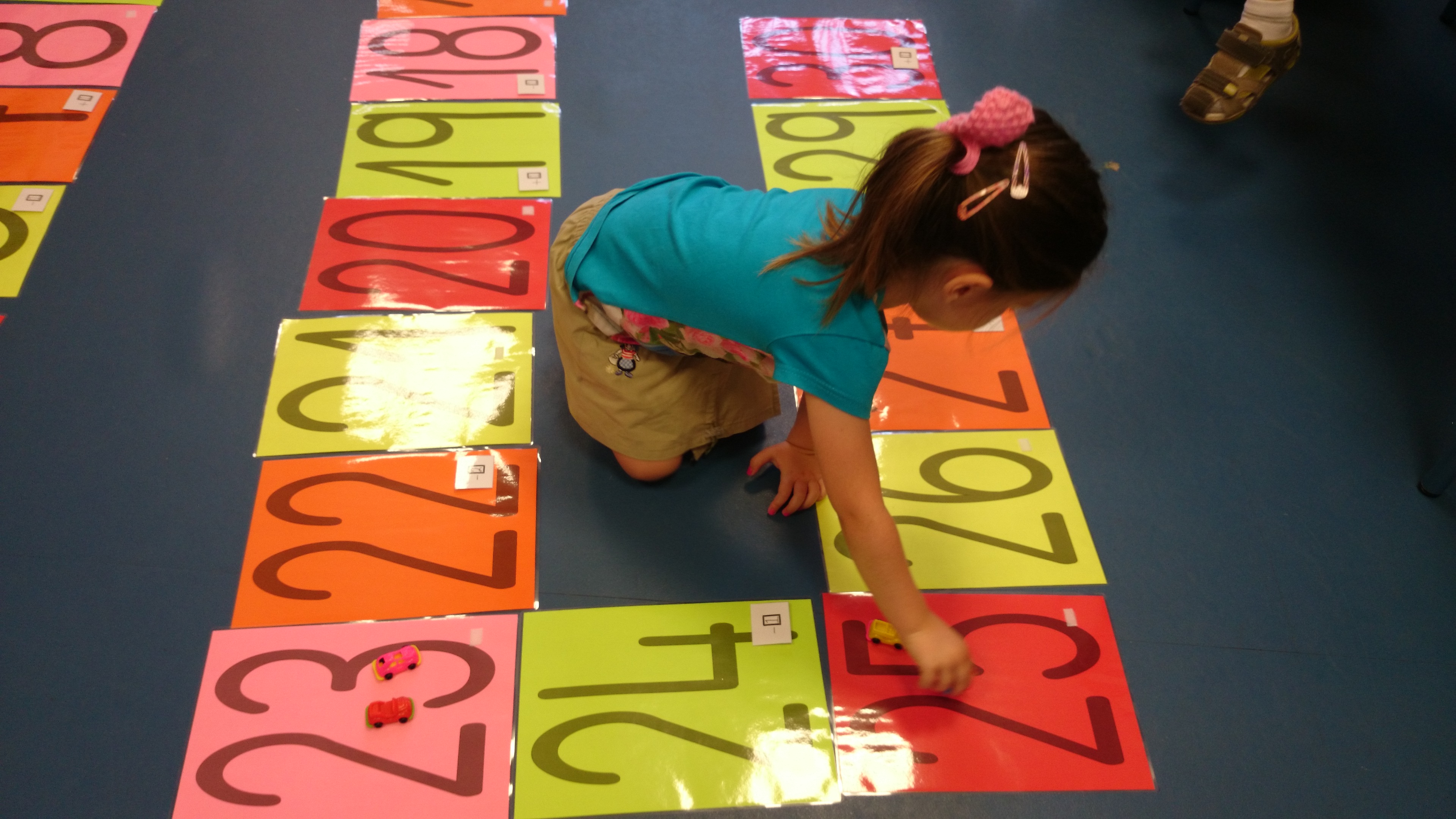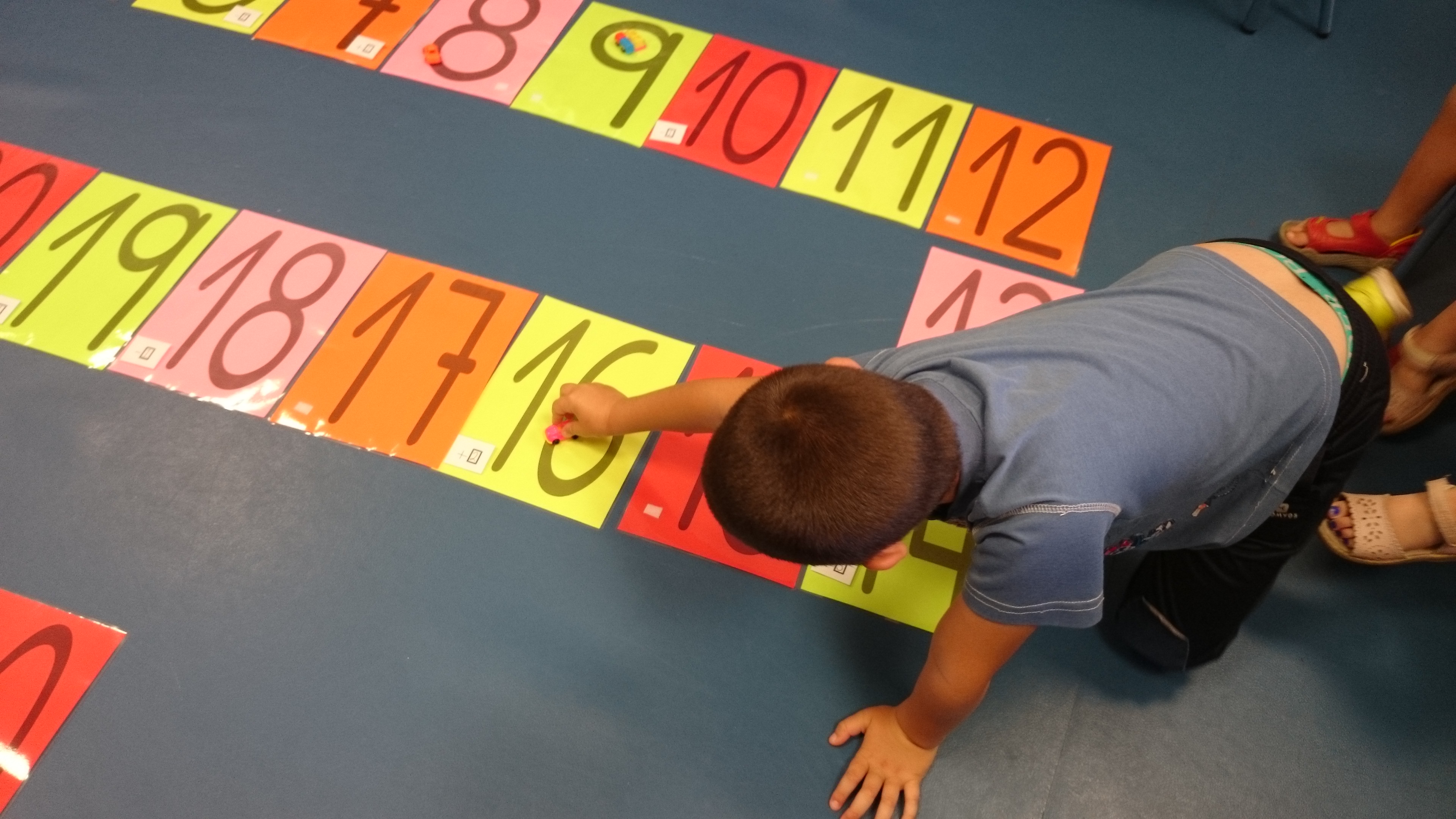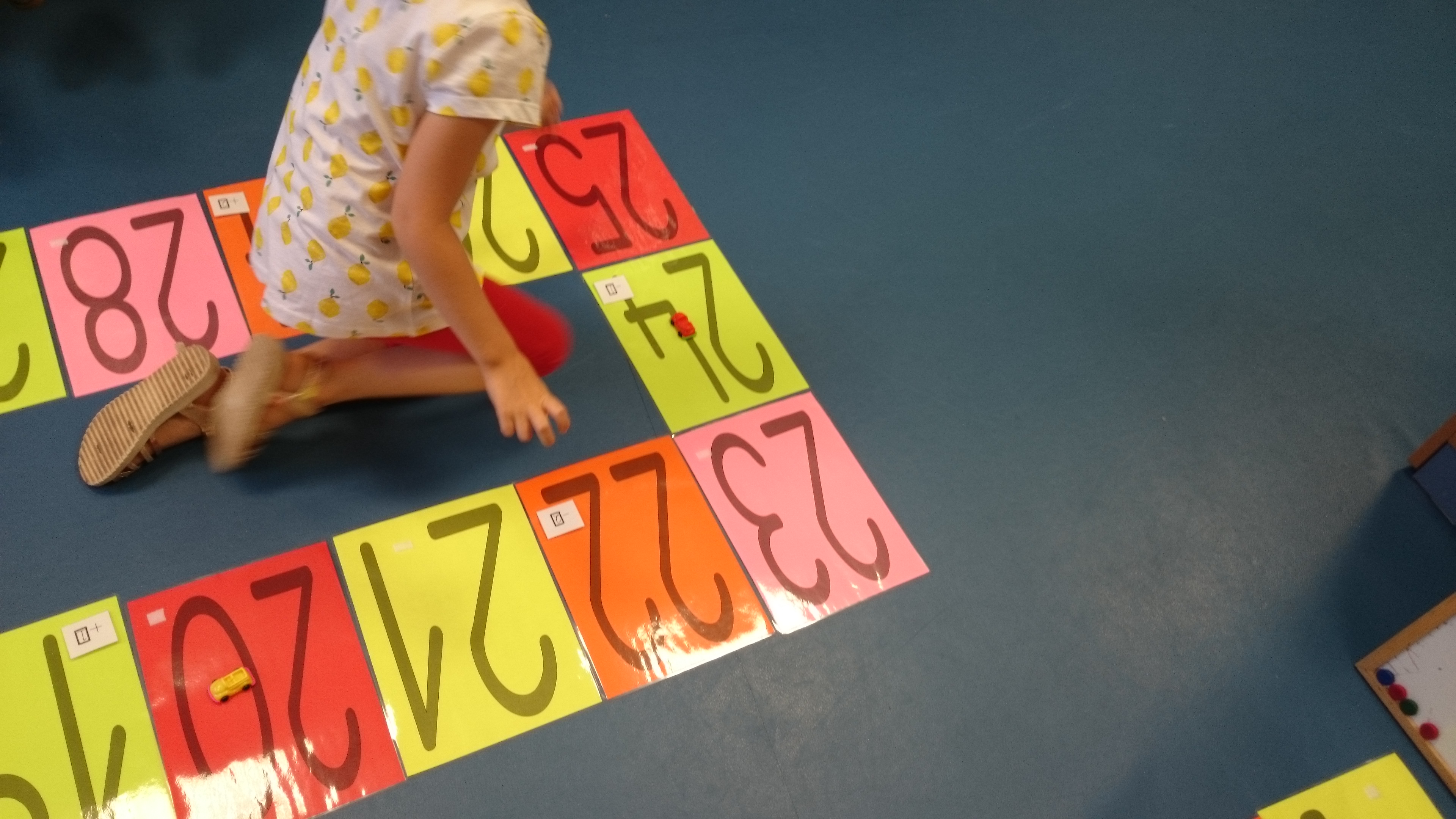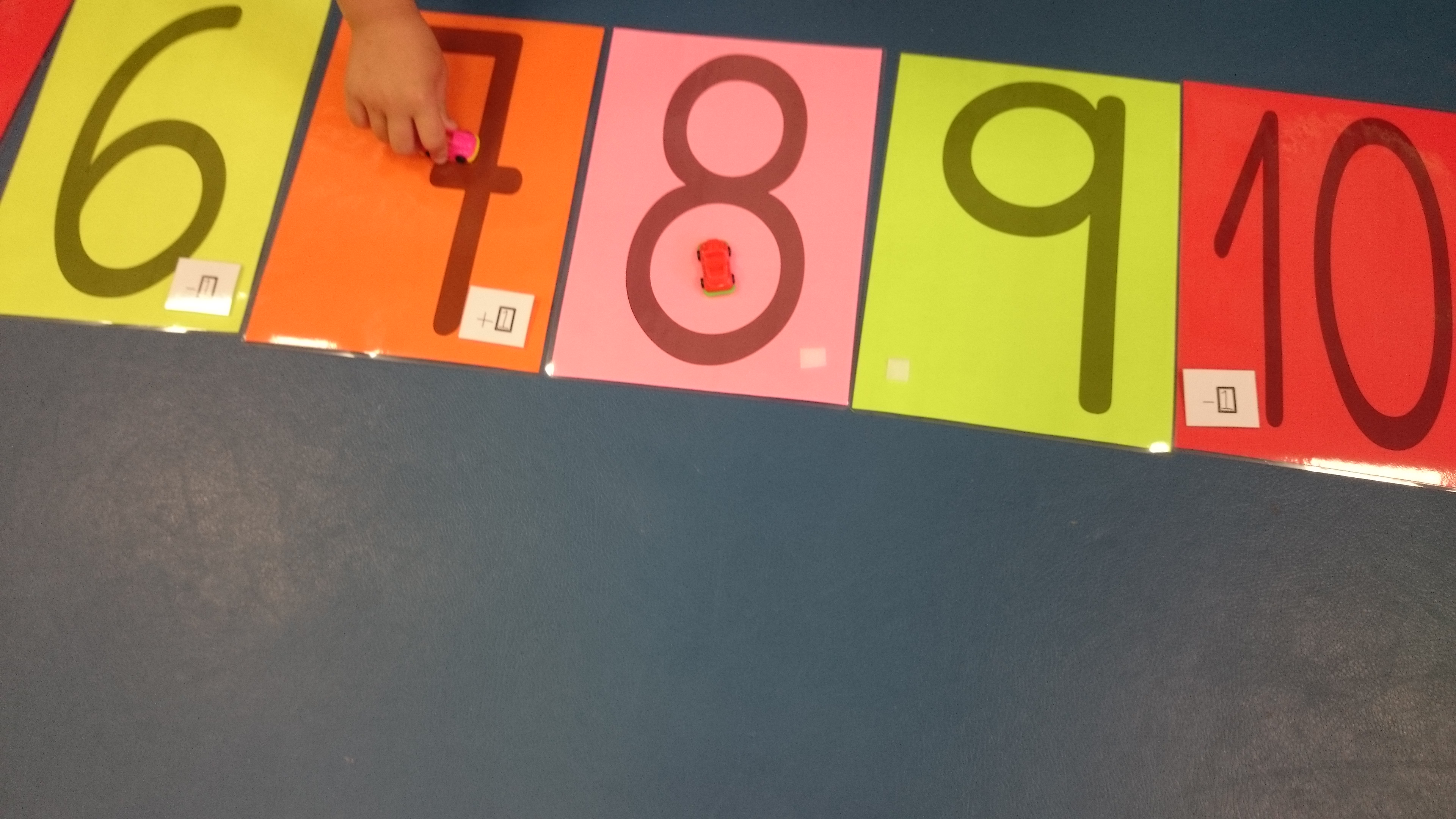 En este juego Lucía ha aumentado las cantidades hasta el 30 y han jugado a modo de carrera de coches.Las tarjetas se pegan con velcro de forma aleatoria según el nivel de dificultad que queramos darle al juego.