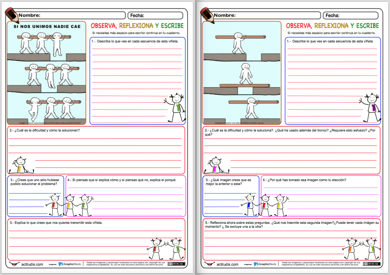 Con estas dos fichas os dejo una nueva actividad que busca fomentar la creación de textos además de ser provocar la observación, reflexión y la opinión del alumnado. En esta ocasión son dos situaciones para trabajar una tras la otra, o bien sólo la primera de ellas titulada «Si nos unimos nadie cae». En la primera se presenta el valor del trabajo en común y en la segunda cómo el esfuerzo personal supera problemas.