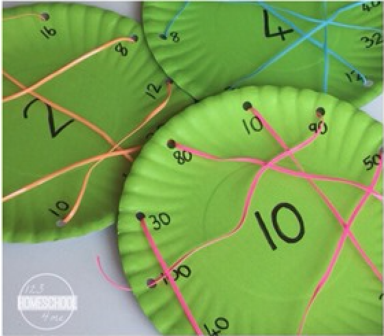 En esta ocasión el sistema es bastante más sencillo ya que para hacer el material sólo basta unos platos de cartón, cuerda (cola de ratón), rotulador para poner las cantidades y un talador para hacer los agujeros. Las posibilidades muchas: amigos del diez, primeras sumas y restas, tabla se multiplicar,… o incluso si lo queremos usar en lenguaje para formas palabras bisílabas.