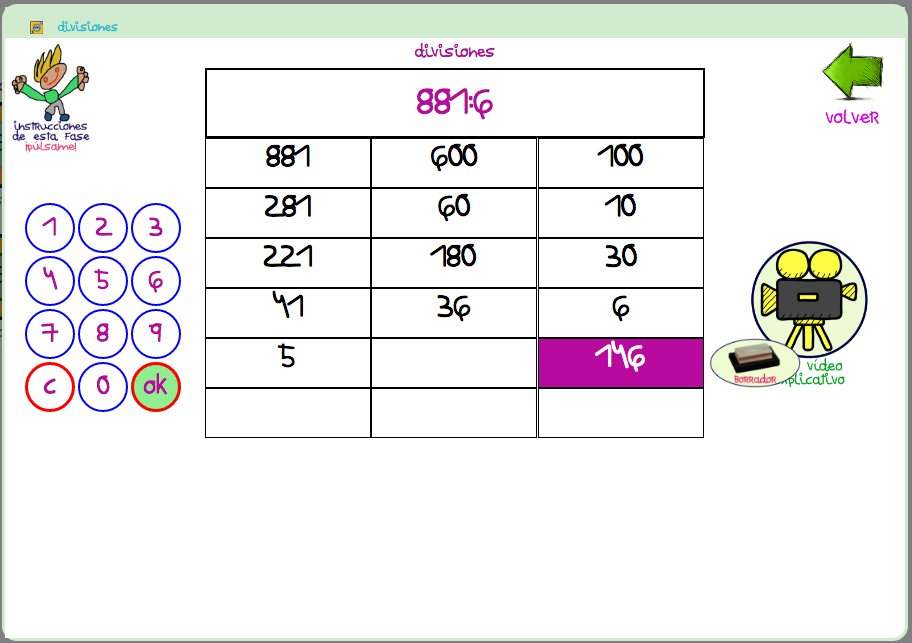 También ofrece dos opciones de división por un y por dos cifras, y en ambas a su vez entre números de dos, tres y cuatro cifras. Al igual que en anteriores actividades podemos seguir la progresión de niveles o repetir actividades dentro de un mismo nivel.