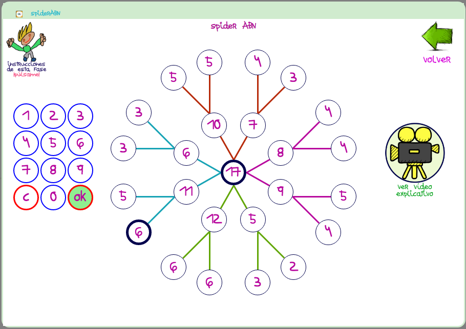Es el nombre que le han dado a la descomposición en rama en esta web, que no les falta el humor, según la cual partimos de un número central que vamos descomponiendo en suma de dos sumandos los cuales se descomponen a su vez en otras dos sumas. Dispone de seis niveles de dificultad progresiva, pero podemos seguir haciendo ejercicios del nivel que queramos haciendo nuevamente clic en el nivel tantas veces como queramos.