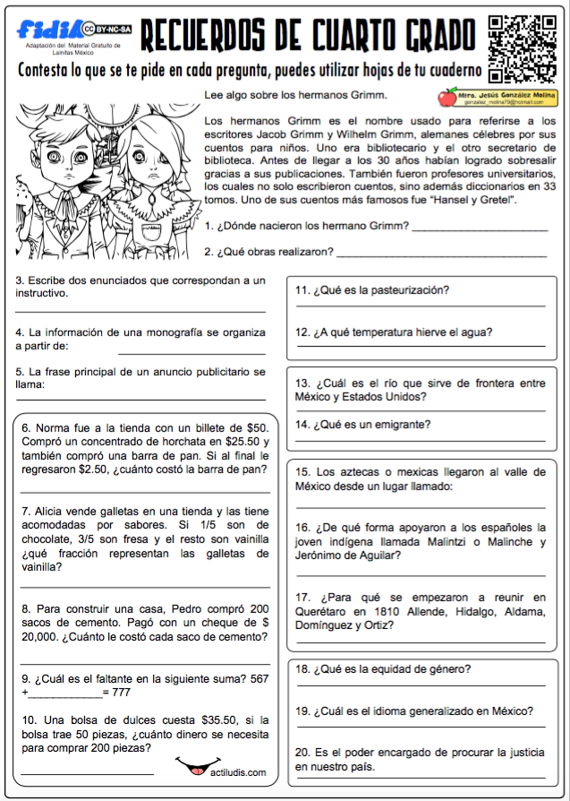 El profesor Jesús González Molina de la Escuela Primaria Vicente Guerrero y catedrático en el nivel de posgrados, desde Los Placeres del Oro, en el estado de Guerrero, México, nos envía un repaso de conocimientos de cuarto grado que ha realizado a partir de una adaptación del material gratuito de Lainitas México y que vendrá muy bien para los primeros días del curso.