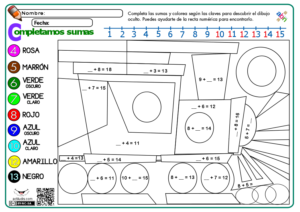 La siguiente actividad busca que el alumnado que va dominando las sumas de dos sumandos de un sólo dígito practique también encontrar el sumando que falta en sumas incompletas. Para ello he preparado una actividad en la que la suma no supera el número quince y con una motivación de pintar para descubrir el dibujo oculto en función de los números que va encontrando.