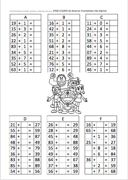 Gema Calero Sanz maestra de 1º de Primaria en el CEIP “Santo Domingo de Guzmán” en Valmojado (Toledo), ha preparando una batería de ejercicios para trabajar las distintas fases en la graduación de la suma y nos envía los archivos correspondientes a la fase 3, 4, 5 y 6 que completan los ya publicados.