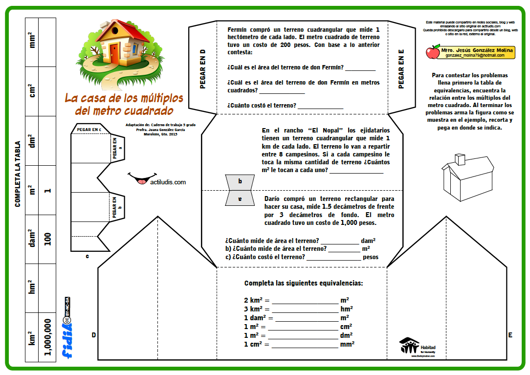 Con esta actividad creada por Jesús González Molina profesor de la Escuela Primaria Vicente Guerrero y catedrático en el nivel de posgrados, desde Los Placeres del Oro, en el estado de Guerrero, México, se trabaja la escala de magnitudes del metro cuadrado y se plantean tres situaciones problemáticas y un ejercicio de equivalencias con el apoyo motivador de montar una casita de papel.