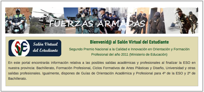 Ana Herrera, por el interés general que puede tener, nos envía la guía que ofrece el equipo técnico provincial de Jaén para la tutoría en secundaria y el salón virtual del estudiante. En este portal encontrarás información relativa a las posibles salidas académicas y profesionales al finalizar la ESO en la provincia de Jaén: Bachillerato, Formación Profesional, Ciclos Formativos de Artes Plásticas y Diseño, Universidad y otras salidas profesionales. Igualmente, dispones de Guías de Orientación Académica y Profesional para 4º de la ESO y 2º de Bachillerato.» en 2011 incluso tuvo un premio nacional
