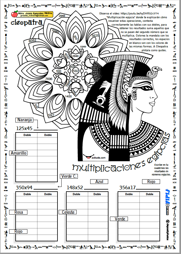Si no conoce el procedimiento puede ver el video «Multiplicación egipcia» a continuación, donde le explicarán cómo resolver estas operaciones. A continuación contesta correctamente las tablas con sus dobles, para obtener los resultados suma aquellos que no se pasen del segundo número que se multiplica. Colorea la mandala con los resultados correctos, los espacios en blanco son con los colores de las mismas formas. A Cleopatra píntala como gustes.