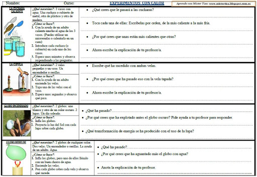 Mario San Bernardino Martín del CEIP Gloria Fuertes, en Meco (Madrid) desde su blog «Aprende con Míster Tiza» nos envía esta magnífica actividad para trabajar con el calor para que el alumnado experimente cómo se transfiere de varias formas y su reacción sobre distintos materiales.