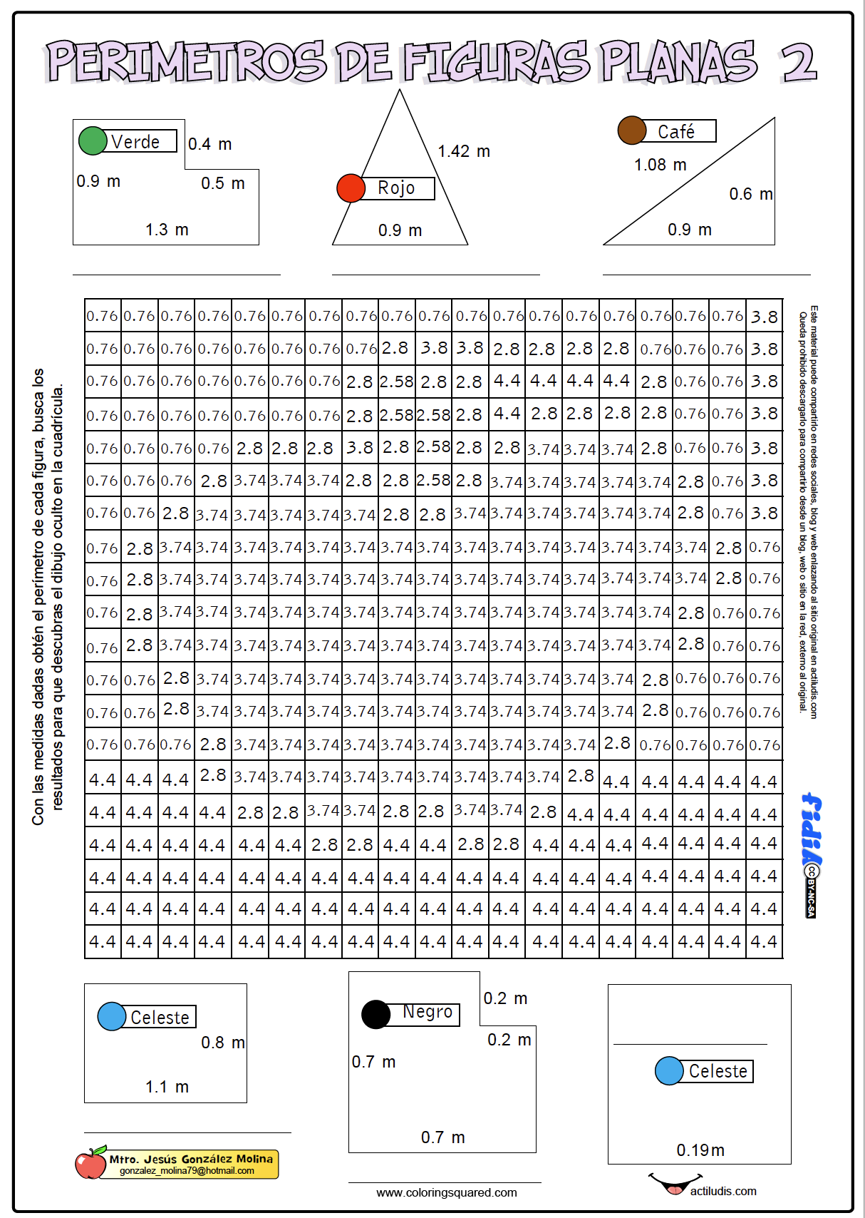 El profesor Jesús González Molina profesor de la Escuela Primaria Vicente Guerrero y catedrático en el nivel de posgrados, desde Los Placeres del Oro, en el estado de Guerrero, México, nos remite una nueva actividad para trabajar los perímetros de figuras planas para lo cual ha creado un dibujo oculto que se descubrirá coloreando con las claves de las soluciones de cada figura.