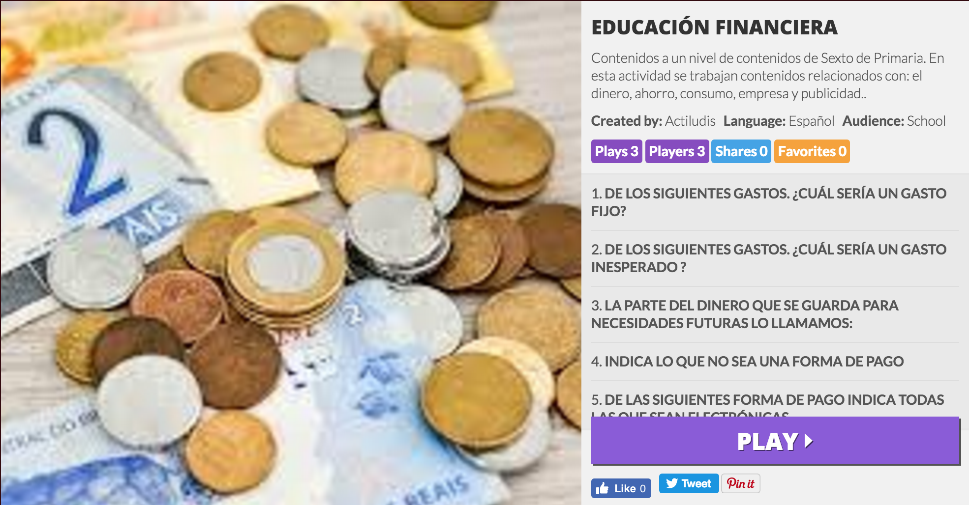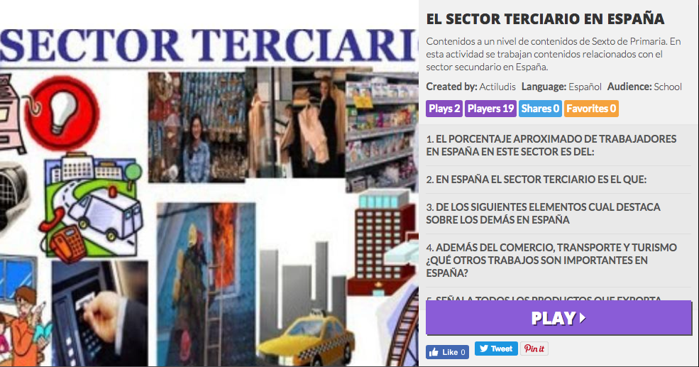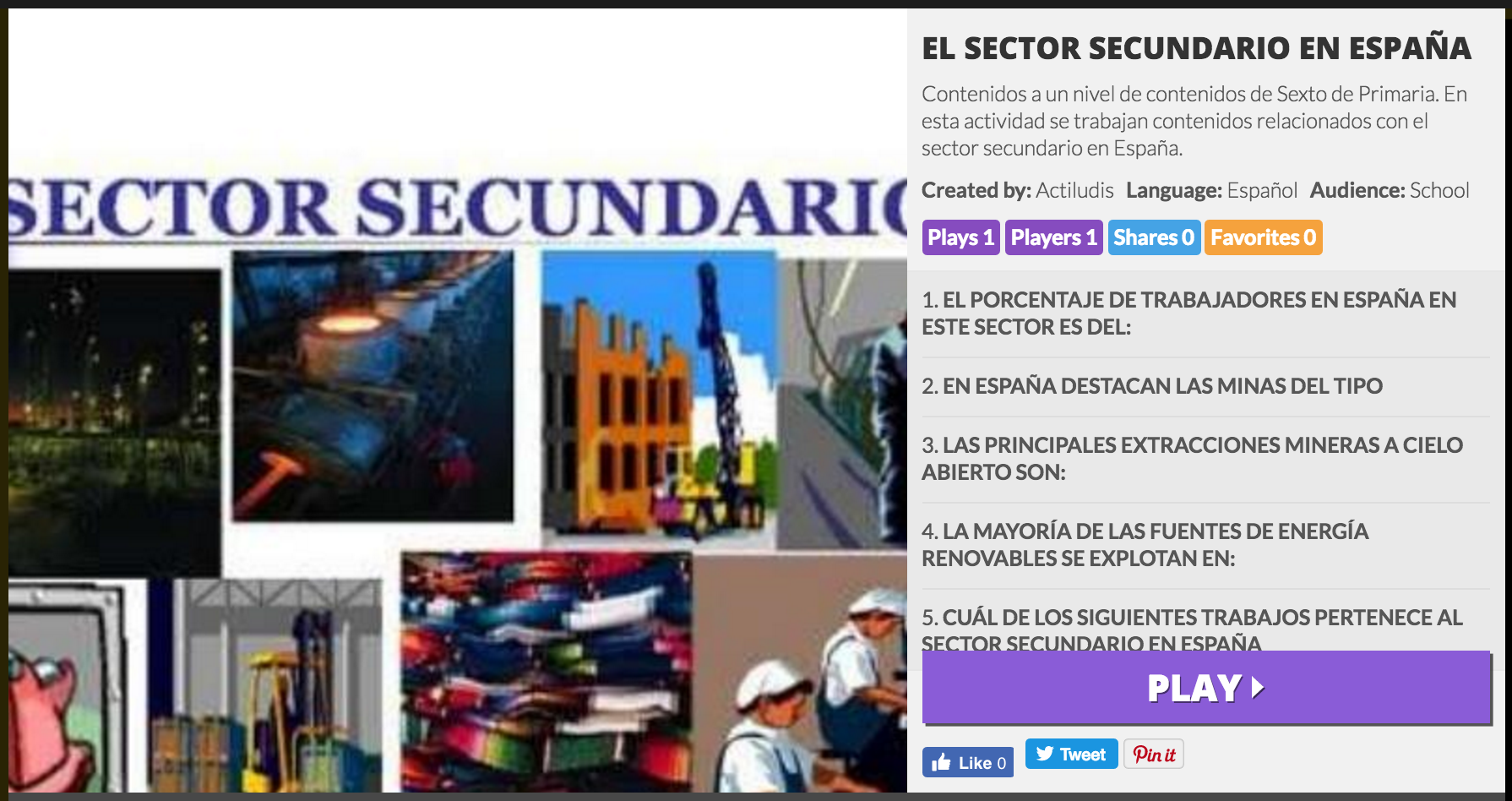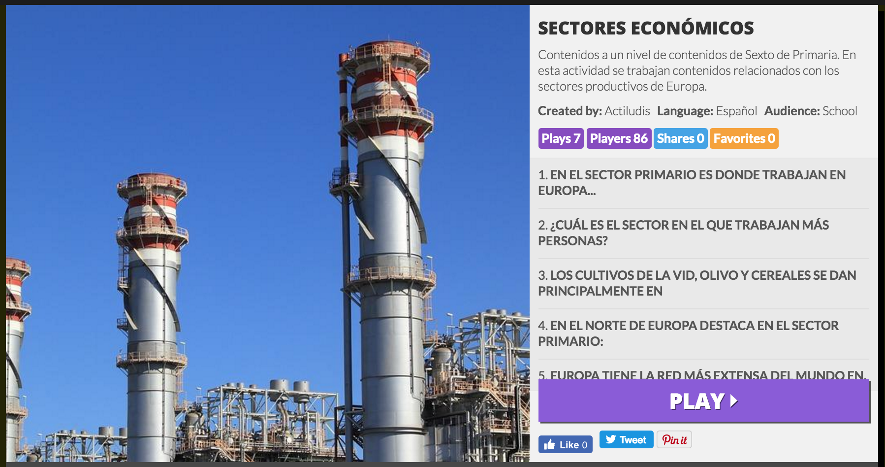 Con estos seis «Kahoot» se repasa con mediante una batería de 10 preguntas cada uno los sectores de producción con un nivel de contenidos de Sexto de Primaria. Concretamente en esta actividad se trabajan los siguientes contenidos por separado de: sectores económicos, de Europa, de España y Andalucía, cultura financiera (dinero, ahorro, consumo, publicidad y empresa)