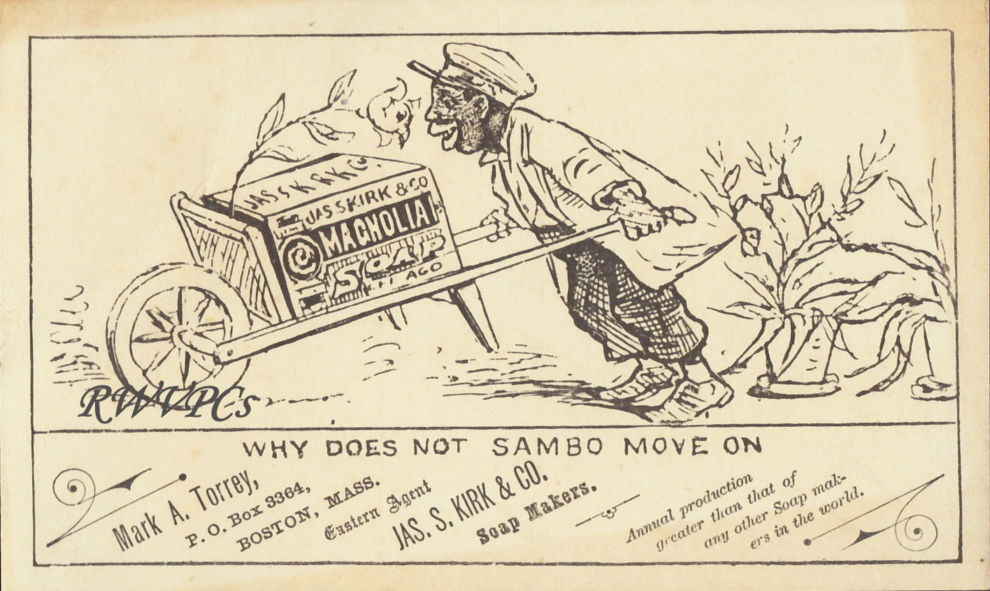 La siguiente litografía es un anuncio de «Mark A. Torrey» de Boston, fabricante de jabón y que no he sabido nunca la relación de este tipos de anunciantes con los juegos de agudeza visual. Sea como sea, me resulta perfecto, porque en esta imagen se nos pide el porqué el carretillero llamado Sambo no pude tirar de la carretilla. Es una imagen muy sencilla, ideal para iniciar a los más pequeños en las observaciones con detalle.