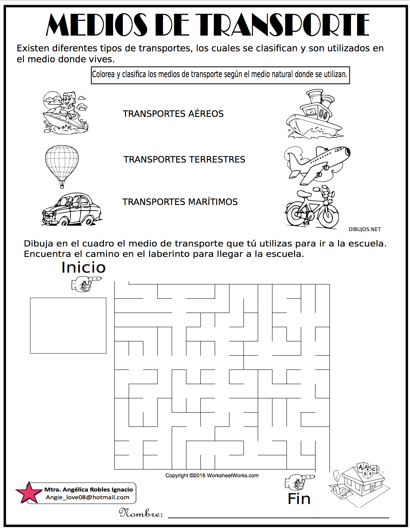 La actividad es una sencilla ficha para trabajar en el Primer Ciclo de Primaria los medios de transporte. Para ello empezamos identificando distintos transporte en función del medio en el que se mueven y a continuación se propone una dibujo de un medio de transporte que nos llevará a través de un laberinto hasta el colegio.