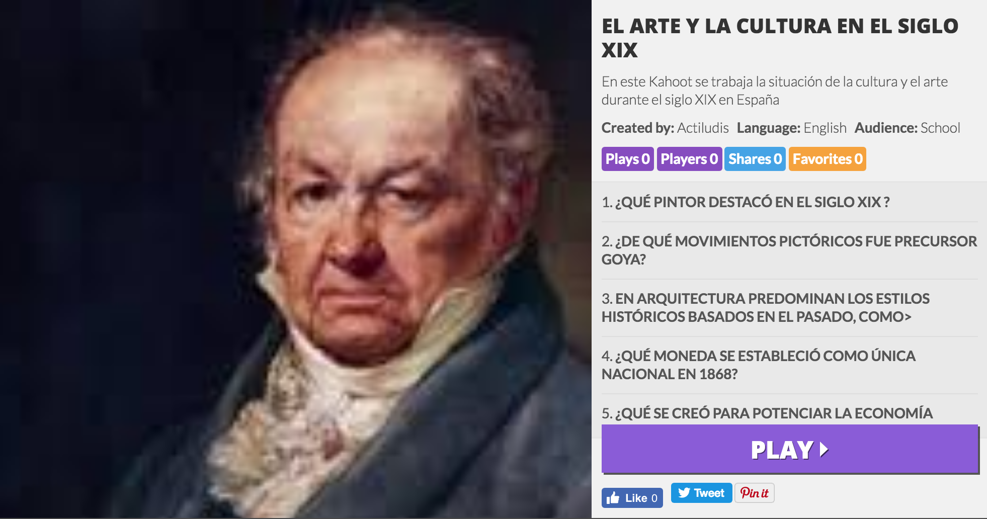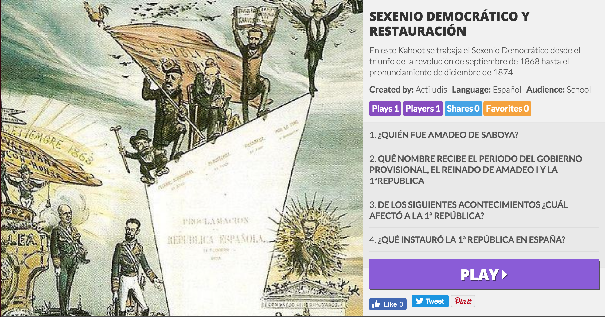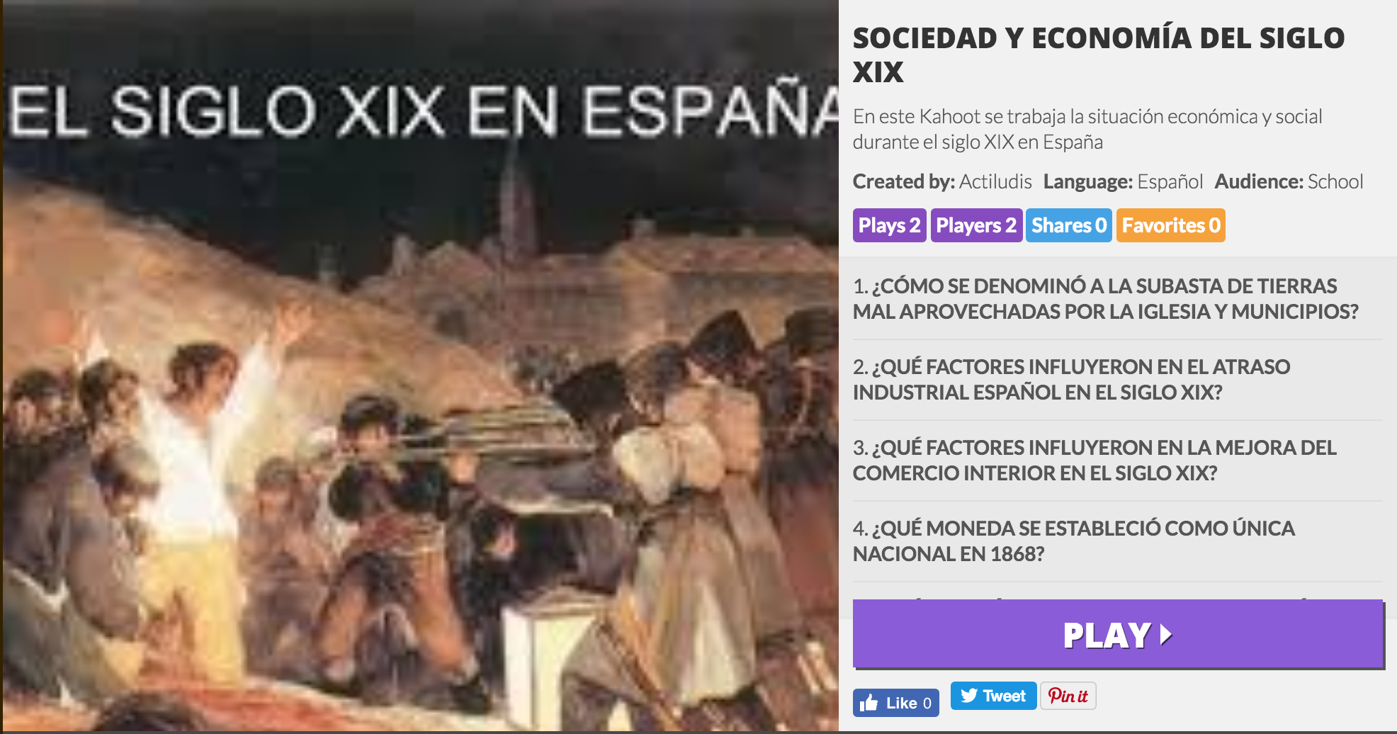 Con estos cuatro «Kahoot» realizamos un repaso de los contenidos relativo a la historia de España en el siglo XIX mediante baterías de 10 preguntas a un nivel de Sexto de Primaria y que concretamente en estas actividades trabajamos: el periodo desde la guerra de la independencia de los franceses hasta el reinado de Isabel II, el sexenio democrático y la restauración con el época de Amadeo I, la !º República y la restauración borbónica. Así mismo también se trabajan los contenidos relativos a la sociedad, la economía, el arte y la cultura en la España del siglo XIX.