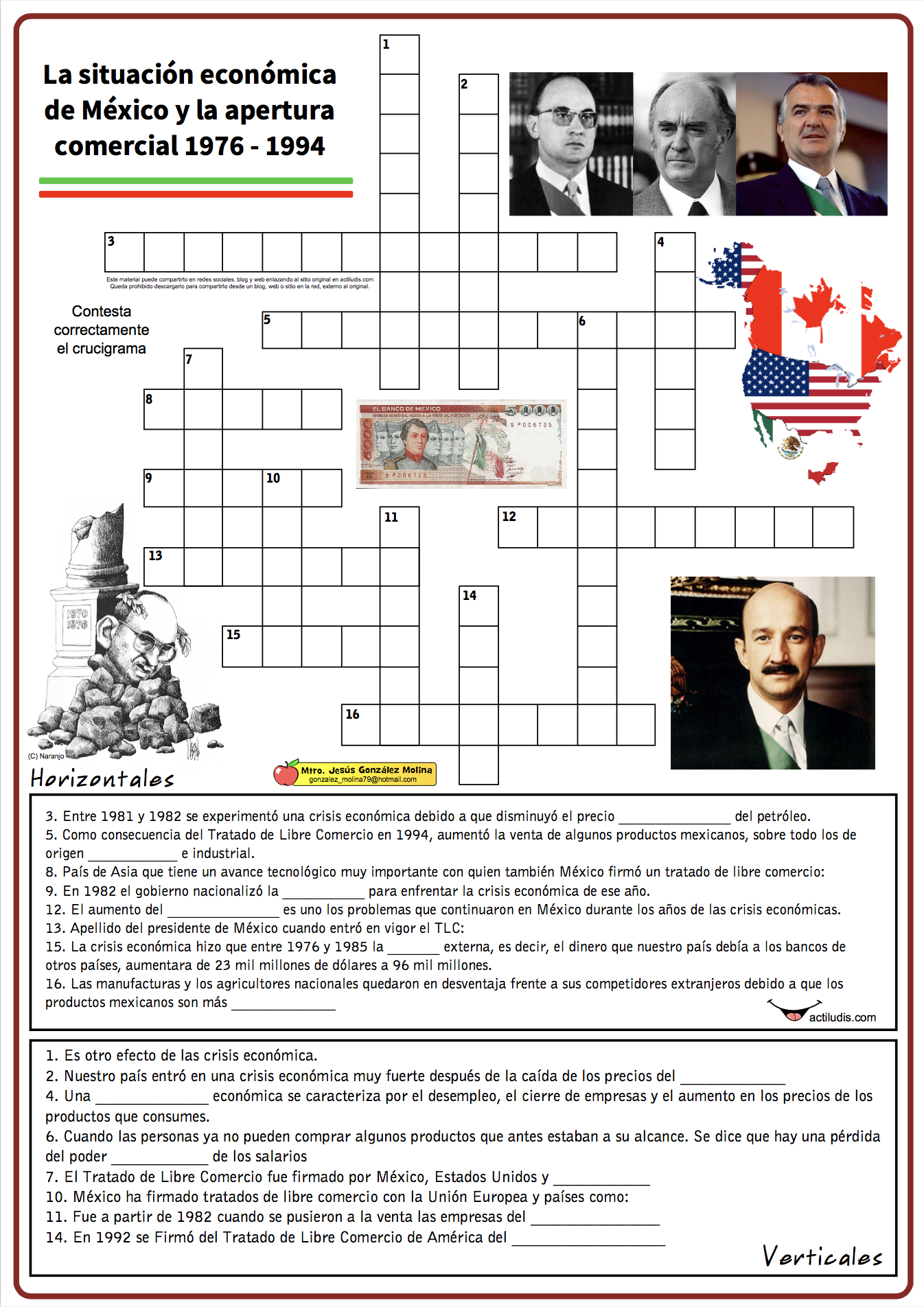 El siguiente crucigrama para trabajarla situación económica en México y la apertura comercial entre los años 1976 y 1994. Consta de catorce frases para completar con la palabra que hay que incluir en el crucigrama.