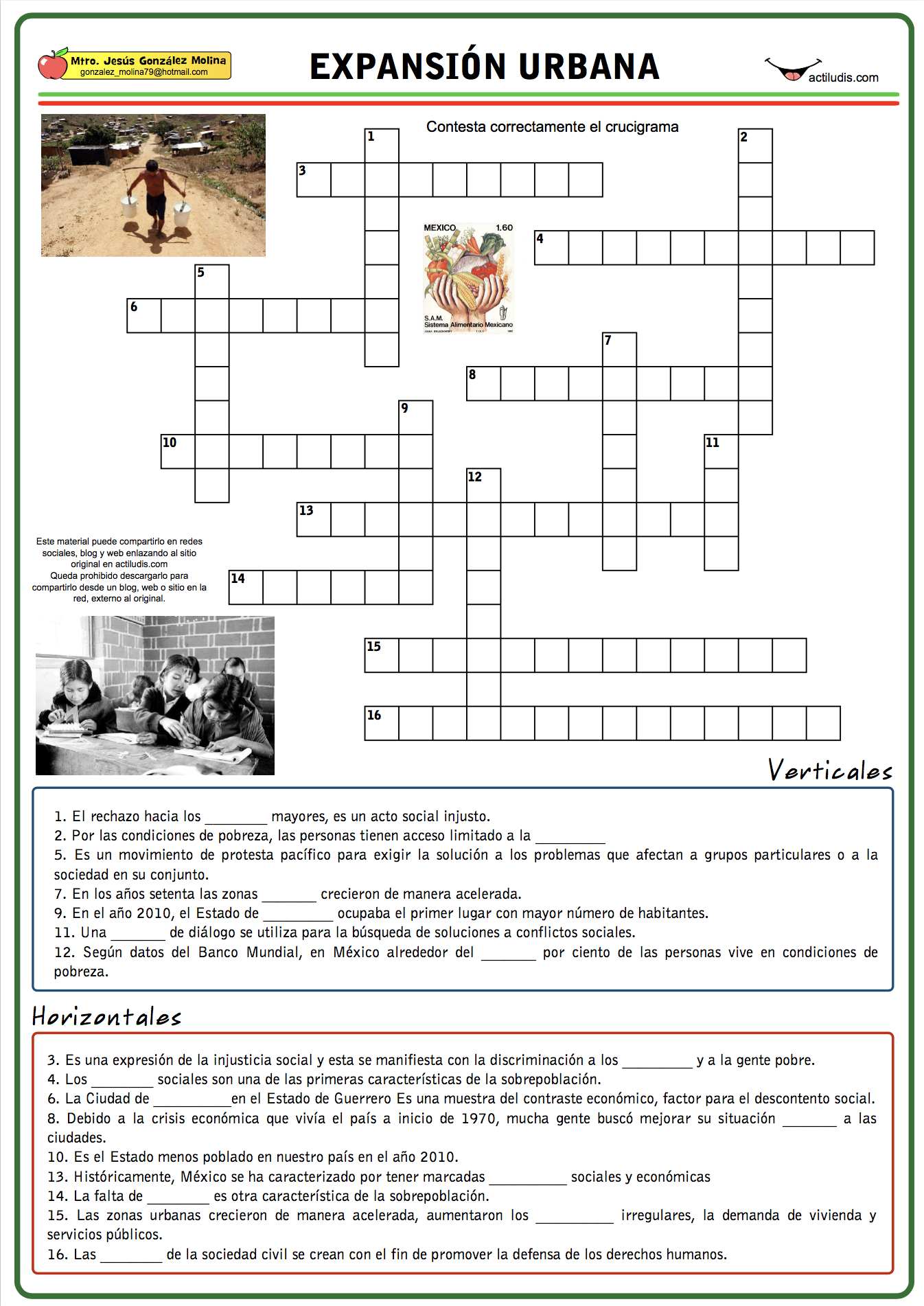 El siguiente crucigrama para trabajar la expansión urbana centrado en México, consta de dieciséis frases para completar con la palabra que hay que incluir en el crucigrama y con preguntas directas para responder.