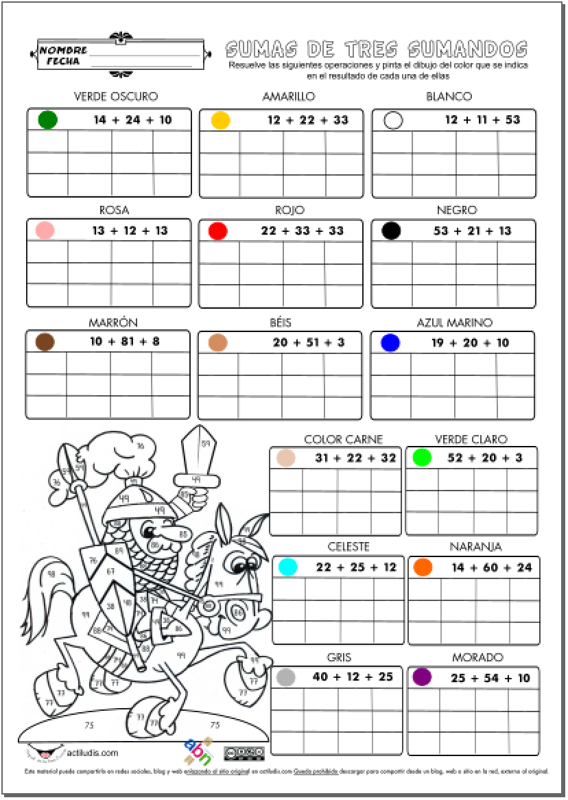 La siguiente ficha es una adaptación con rejillas ABN de una realizada anteriormente para el cálculo tradicional basado en cifras (CBC) y va dirigida al alumnado de Primero de Primaria. Contiene quince operaciones de sumas de tres sumandos de hasta sólo dos cifras sin formación de decenas o centenas, o lo que llamaríamos sin llevadas en el método tradicional, circunstancia que no existe en el cálculo ABN.