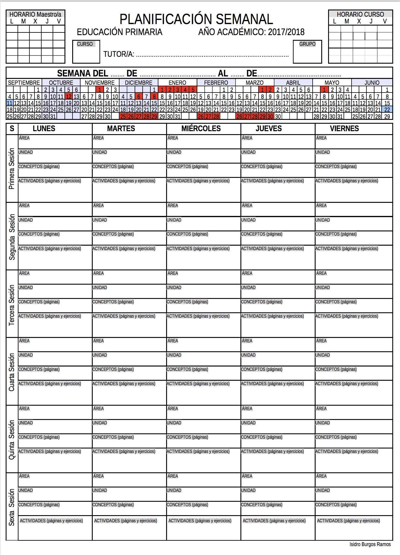 Marisa Risueño Turrado, maestra en el ” CEIP Ntra. Sra. De Los Remedios” de Cártama (Málaga), se ha entretenido, me ha ahorrado trabajo y nos envía para compartir, la planificación semanal actualizada para el curso 2017/2018 sobre el fichero original que creó Isidro Burgos Ramos. Un formato muy cómodo y rápido para programar las actividades para la semana.