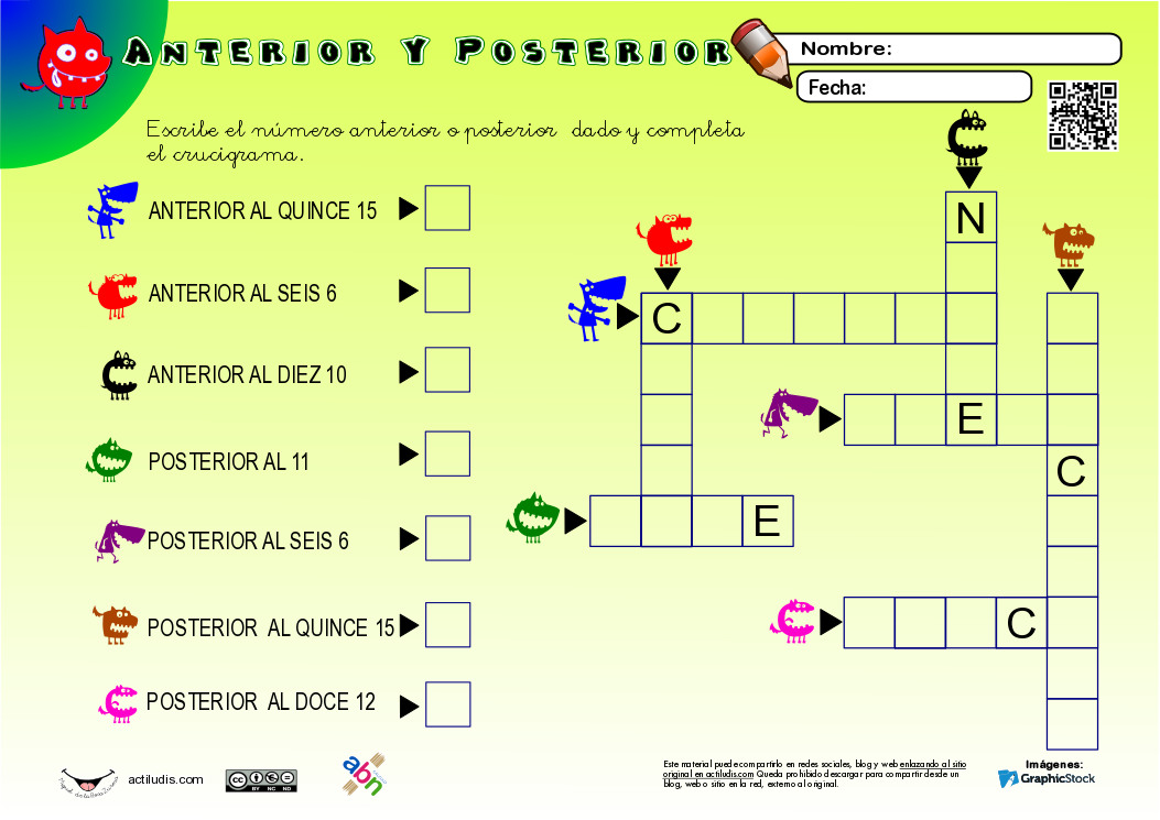 En este artículo dispones de una ficha para trabajar el concepto de anterior y posterior con el apoyo motivador de completar un crucigrama. Al final del artículo hay un enlace a más actividades para trabajar este concepto.