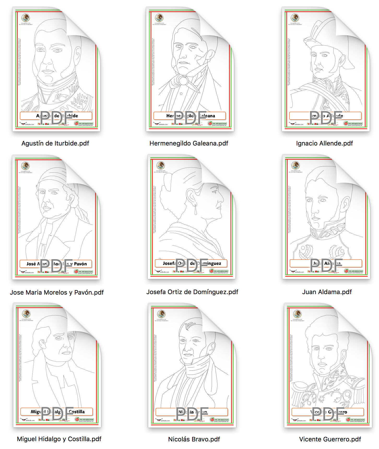 En el archivo encontrará los siguientes: Agustín de Iturbide, Hermenegildo Galeana, Ignacio Allende, José María MOrelos y Pavón, Josefa Ortiz de Domínguez, juan Aldama , Miguel Hidalgo y Costilla, Nicolás Bravo y Vicente Guerrero.