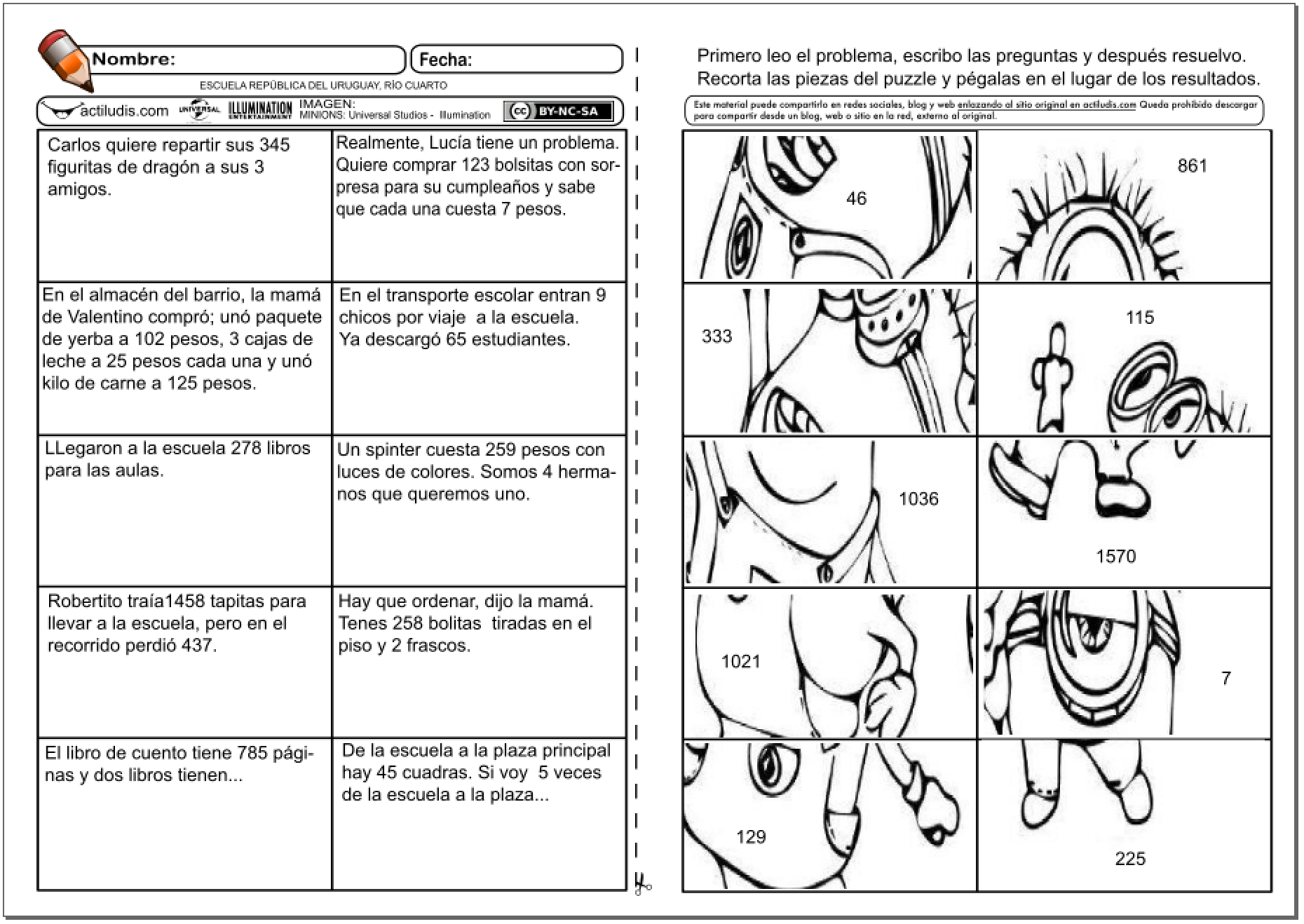 El profesor Valentín Bruno de la Escuela Gral. «Roca» de Rio Cuarto en Córdoba (Argentina), nos envía una ficha que mediante un puzzle poder trabajar problemas incompletos. En estos problemas el alumnado deberá completar su enunciado con la elaboración de la pregunta y después resolver el problemas. Para ello debe tener en cuenta las posibles soluciones propuestas mediante piezas de un puzle.