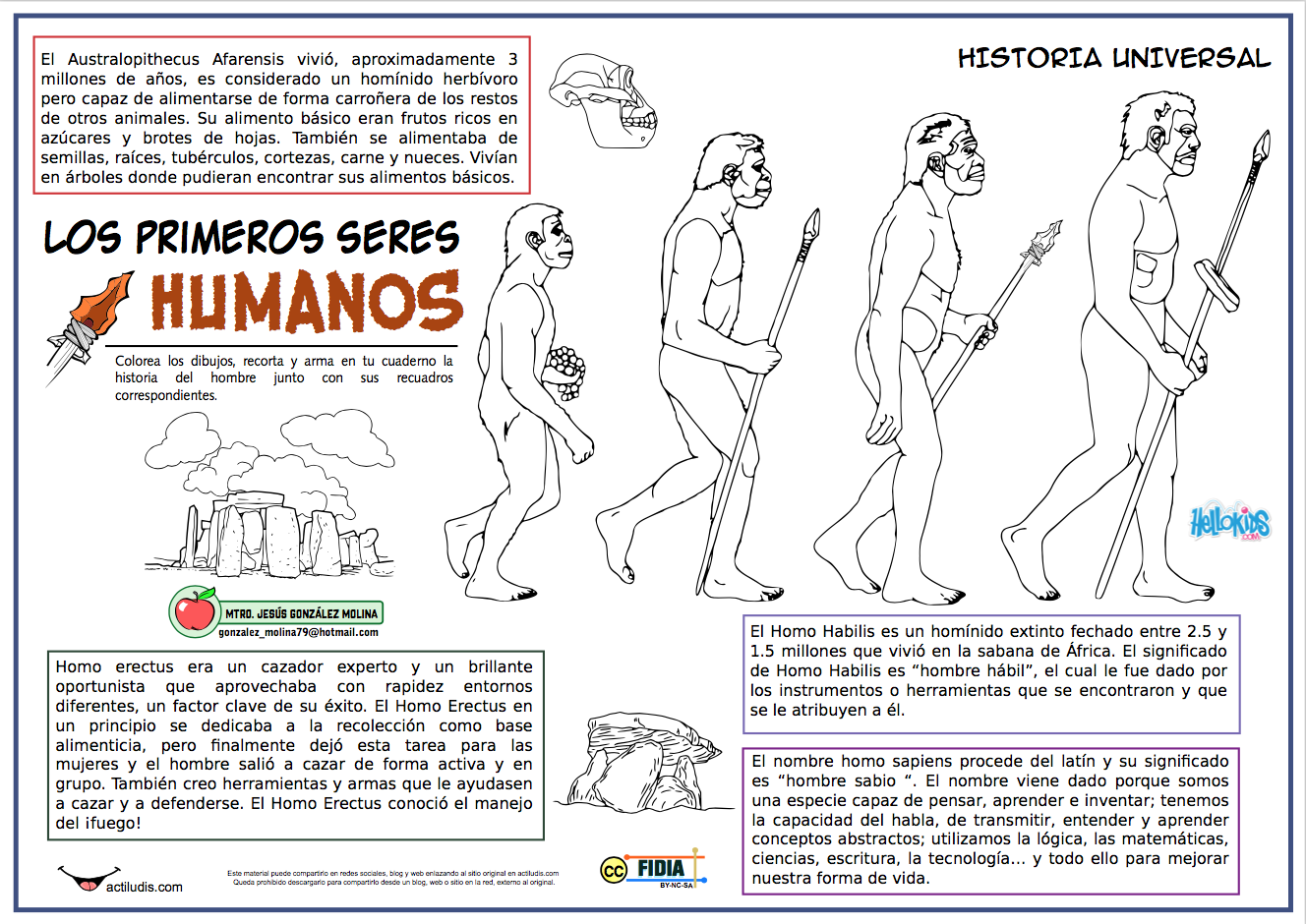 El profesor Jesús González Molina de la Escuela Primaria Vicente Guerrero y catedrático en el nivel de posgrados, desde Los Placeres del Oro, en el estado de Guerrero, México, ha preparado una ficha para trabajar la prehistoria y en concreto los primeros seres humanos mediante un texto y unas imágenes para colorear y recortar, para a continuación armar en el cuaderno la historia del hombre junto con sus recuadros correspondientes.