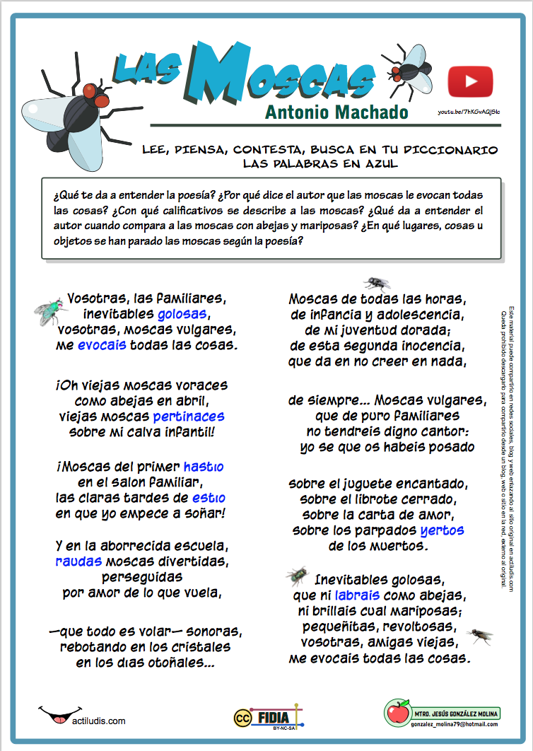 La actividad «Las moscas” de Antonio Machado es un ejercicio de comprensión lectora en la que se pide al alumnado que lea, piense y conteste buscando en el diccionario las palabras que aparecen en azul en el texto.