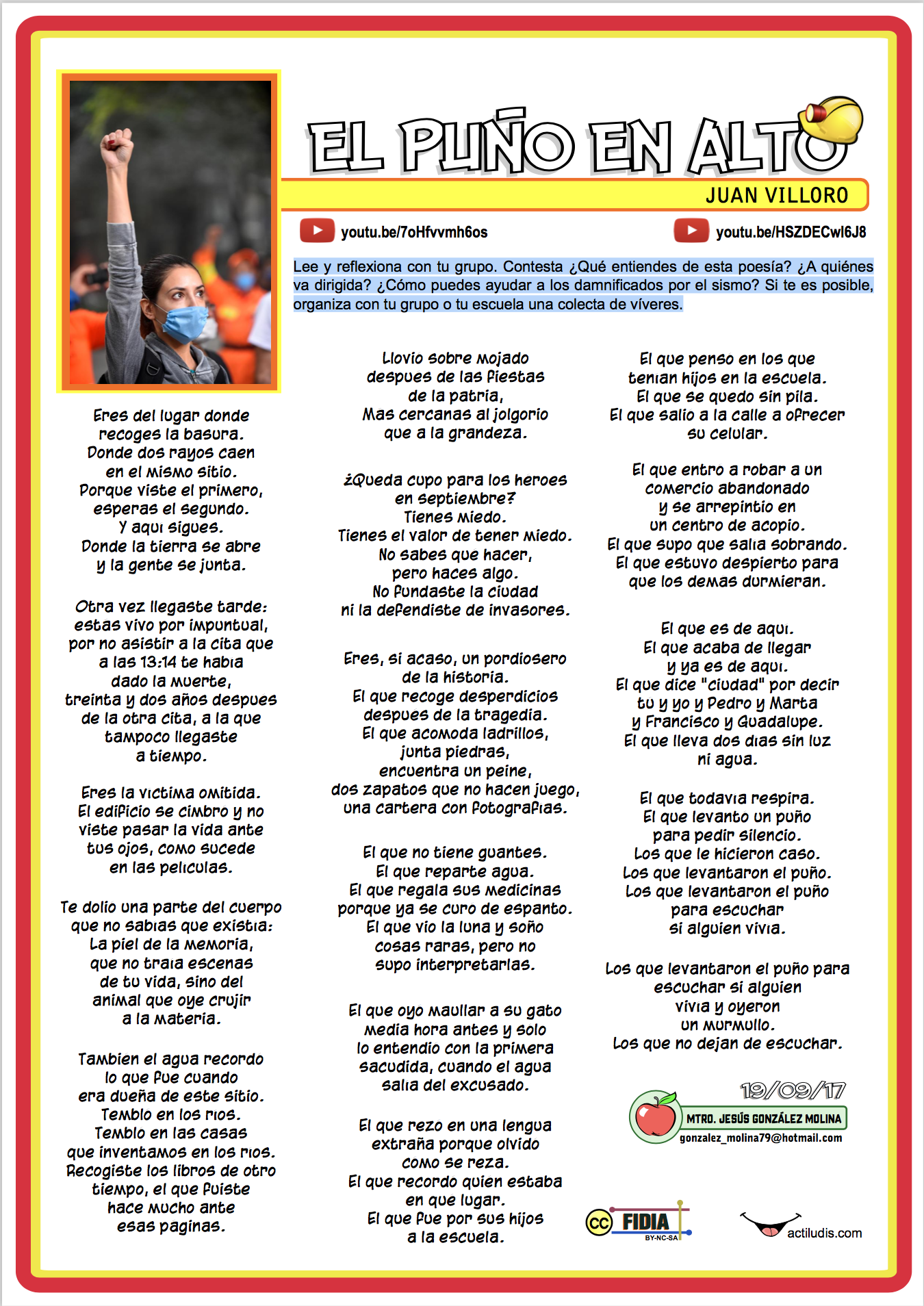 La poesía es de Juan Villoro y su título «Con el puño en alto», y para trabajarla se incluyen dos vídeos, uno de ellos recitado por el propio autor. Una vez visionado se propone leer, reflexionar con su grupo y responder una serie de preguntas.