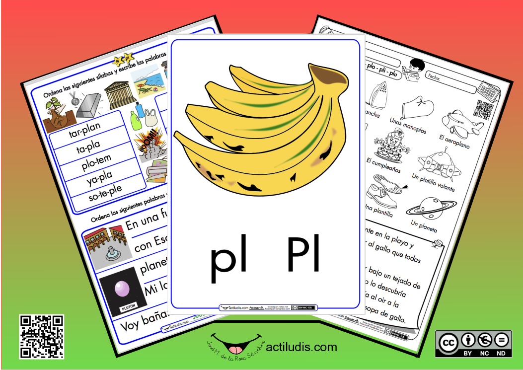 Palabras usadas en las actividad: Plátano, plato, plancha, aeroplano, plástico, plano, cumpleaños, platillo, plinto, explosión, plantilla, planta, multiplicar, manoplas, planeta, cantimplora, playa y pluma.