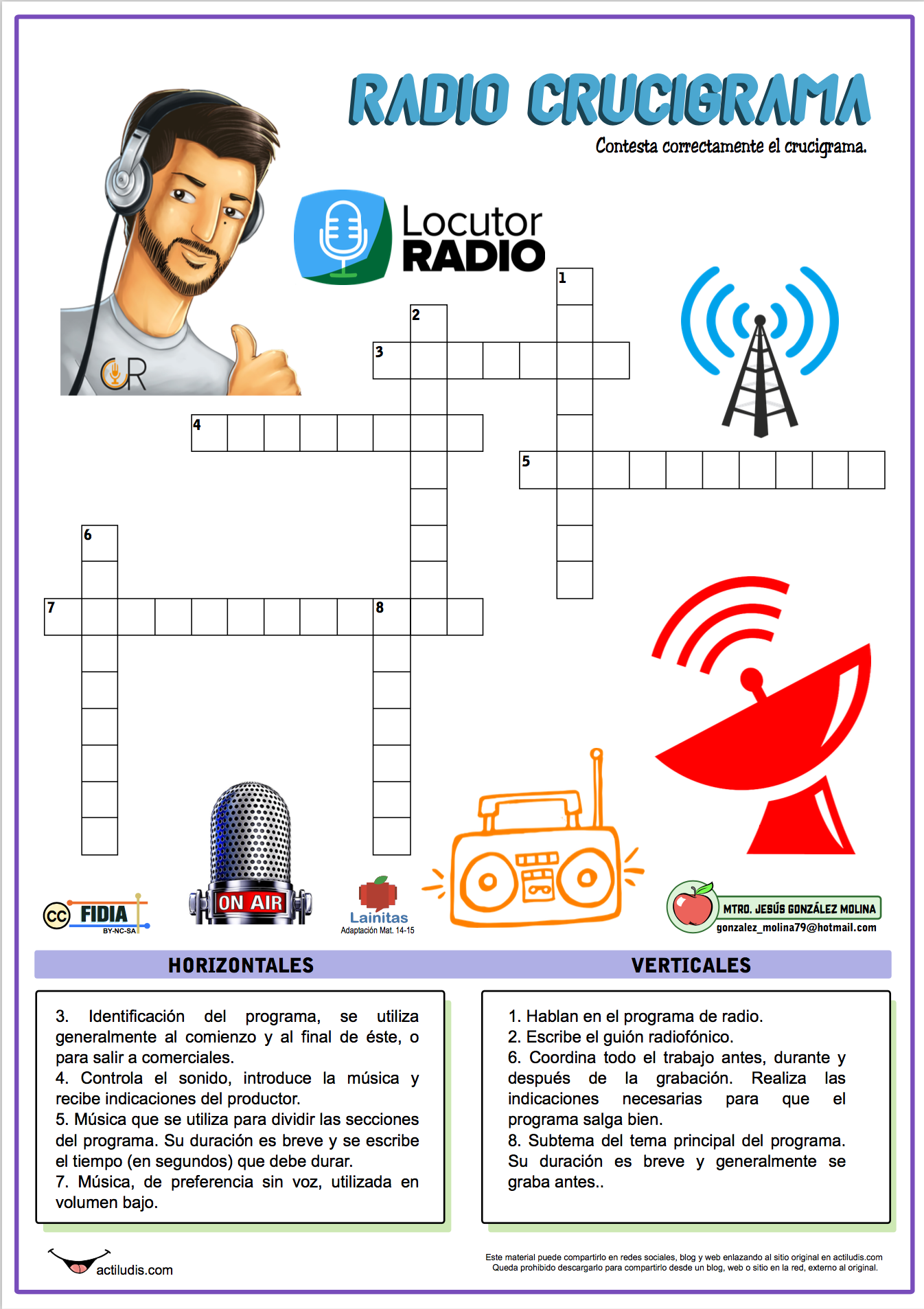 La siguiente actividad puede complementar el aprendizaje sobre la comunicación con la que se suele empezar los contenidos de lenguaje en todos los cursos de Primaria. En ella encontramos un crucigrama cuyas preguntas nos traen vocabulario relacionado con la radio, uno de los medio de comunicación más cercanos.