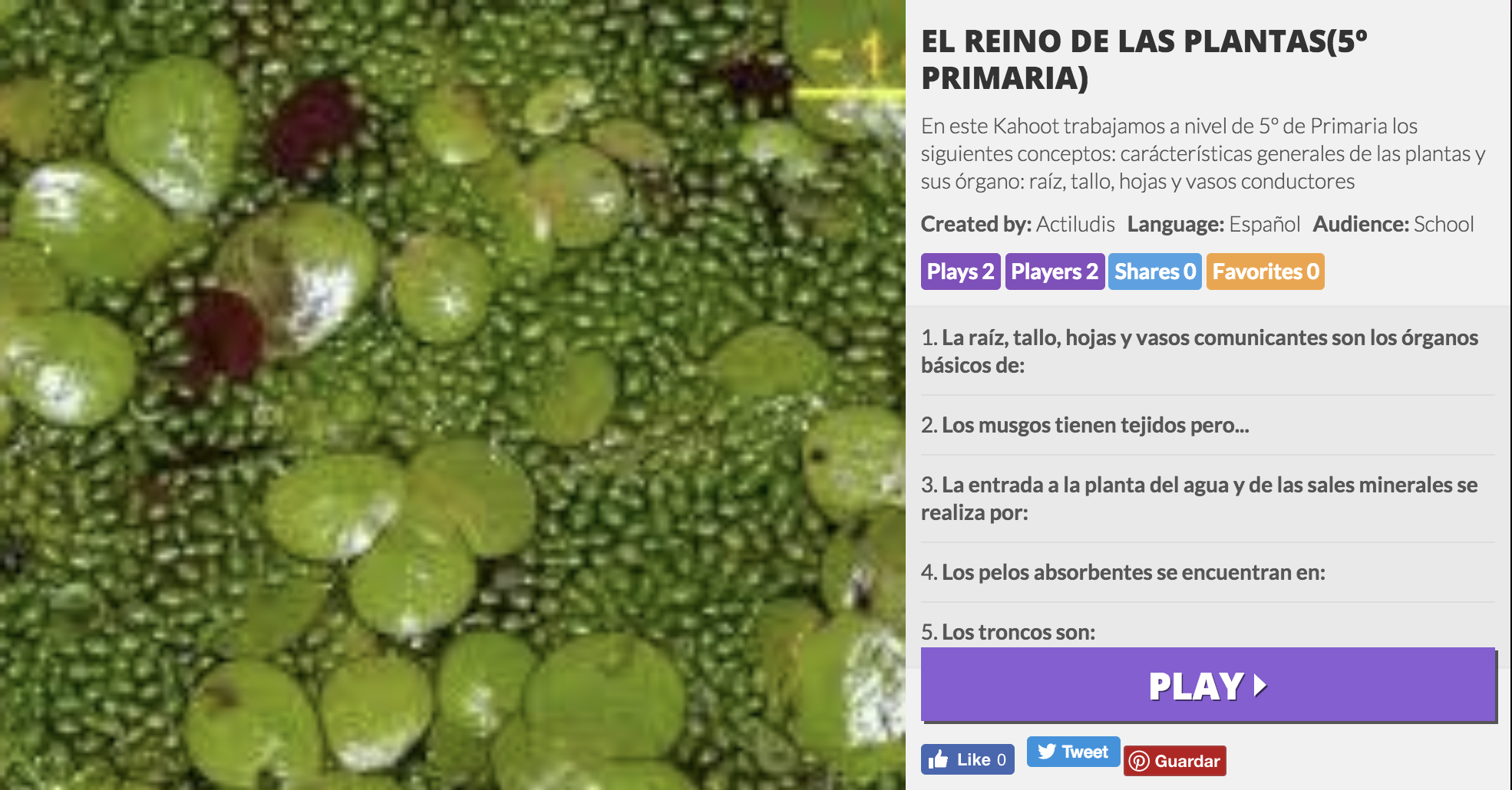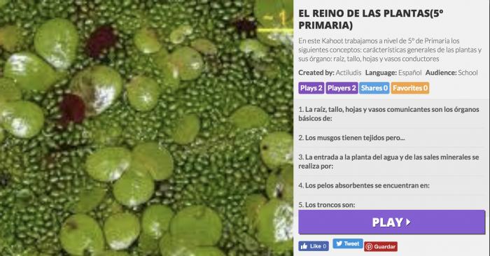 Tu estás aquí: Inicio › Kahoot: “EL REINO DE LAS PLANTAS” para 5º de Primaria › EL REINO DE LAS PLANTAS EL REINO DE LAS PLANTAS Deja una respuestaTu dirección de correo electrónico no será publicada. Los campos obligatorios están marcados con *Comentario * Nombre * Correo electrónico * Web Recibir un correo electrónico con cada nueva entrada. Δ