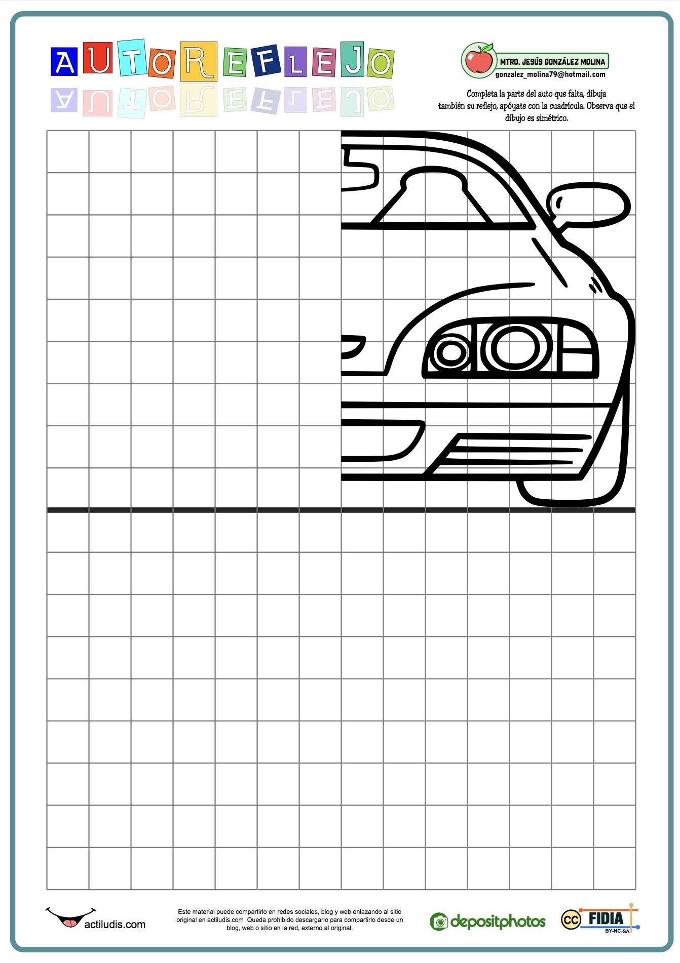 Actividad para trabajar la simetría axial (reflejo) doble, a partir de una parte del auto que falta, con apoyo de una cuadrícula. Una vez completado el coche se les pide una segunda simetría axial. Así mismo se puede usar la misma actividad para en segundo lugar realizar una traslación en lugar de una simetría, diferenciando en la misma actividad dos conceptos matemáticos distintos.