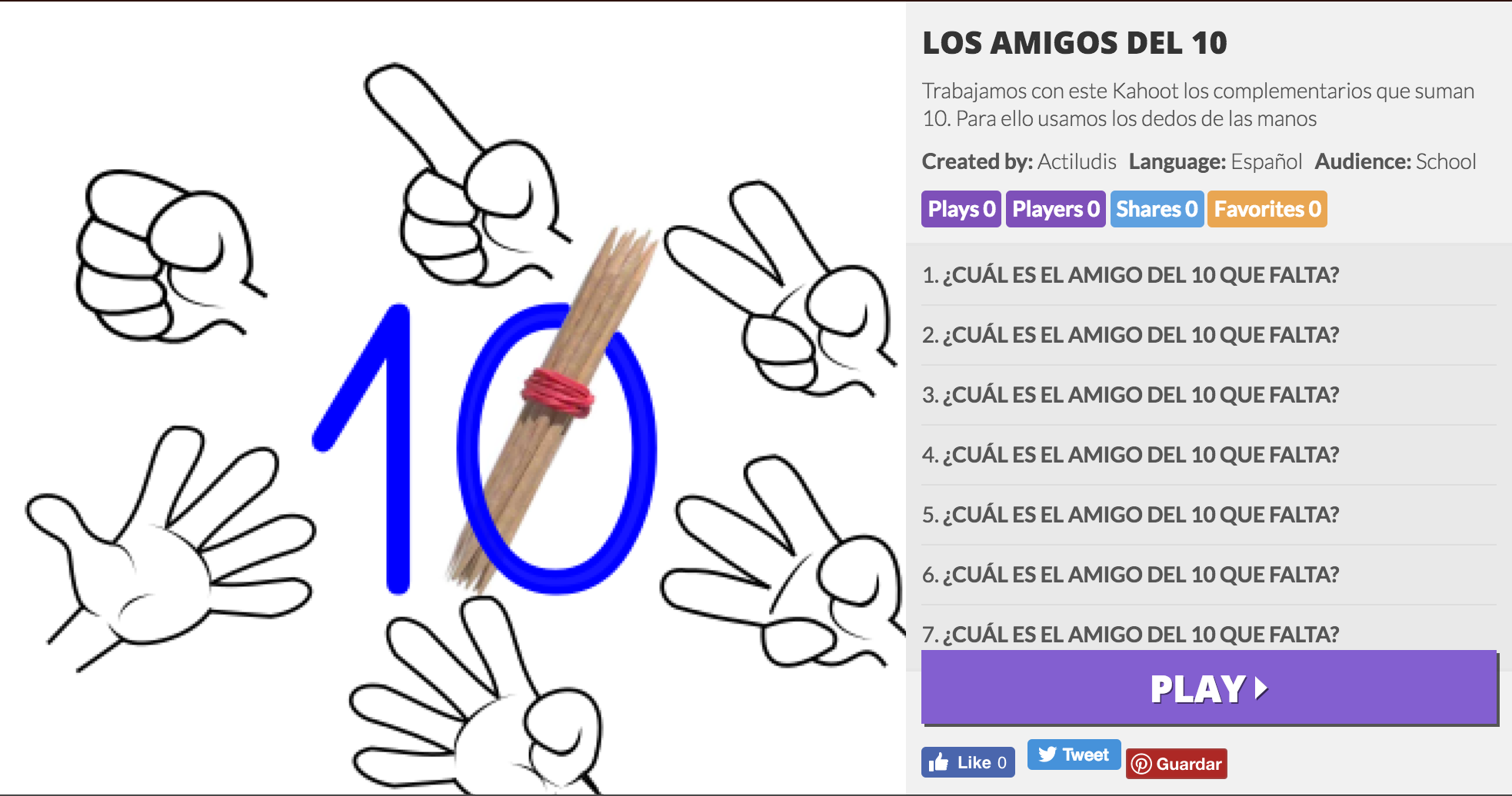 Este kahoot contiene 10 preguntas para descubrir los amigos del 10 que faltan en los dedos de las manos. Al objeto de que tengan tiempo suficiente para contar, el cronómetro se ha puesto al máximo en 2 minutos para la respuesta. Pero si el docente considera que necesita más tiempo para explicar, observar los dedos abiertos y cerrados,… puede también usar la herramienta de «congelar imagen» que disponen las pizarras digitales mediante el botón «Freeze», con lo cual podrán tener el tiempo que necesiten.