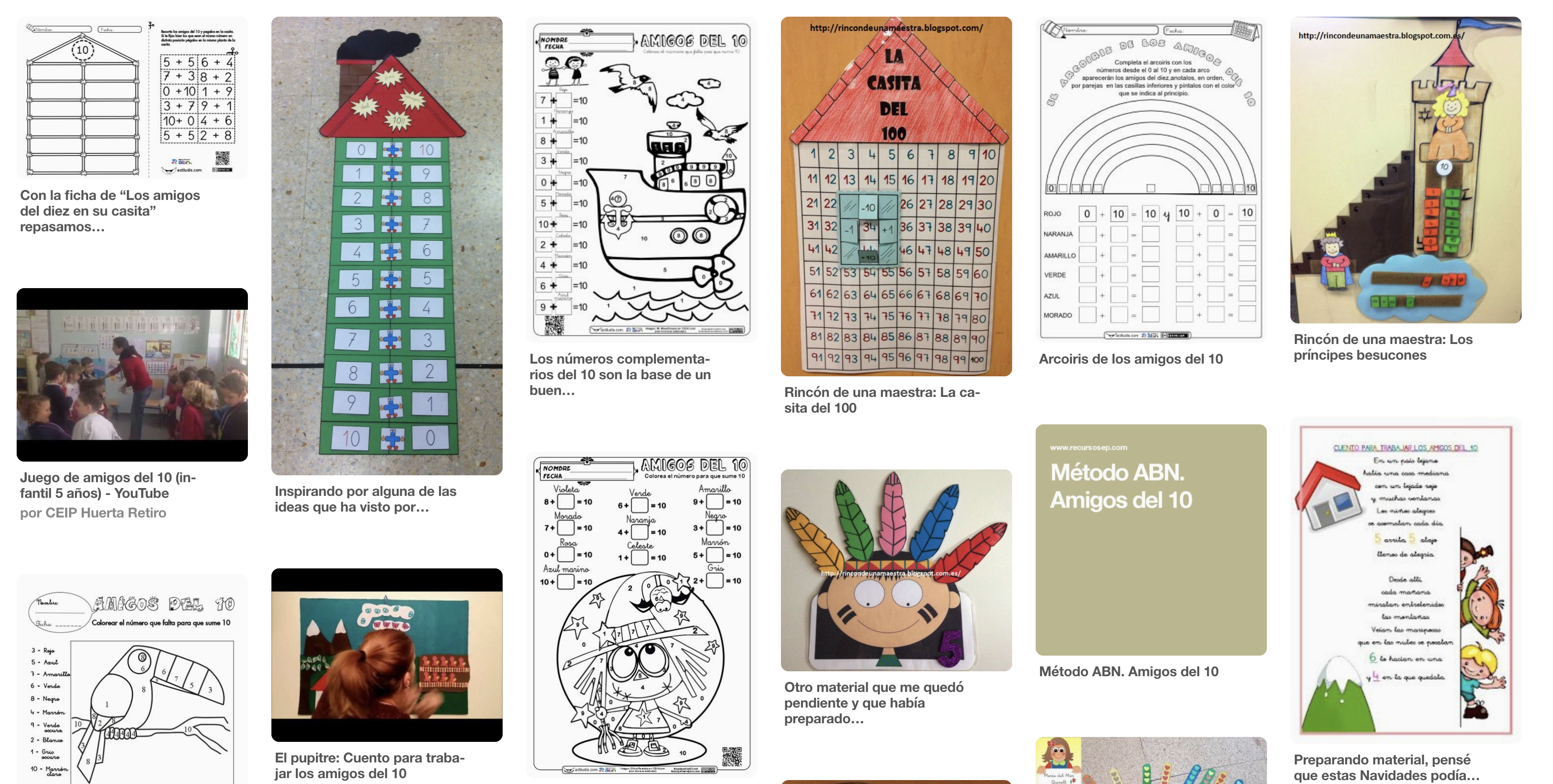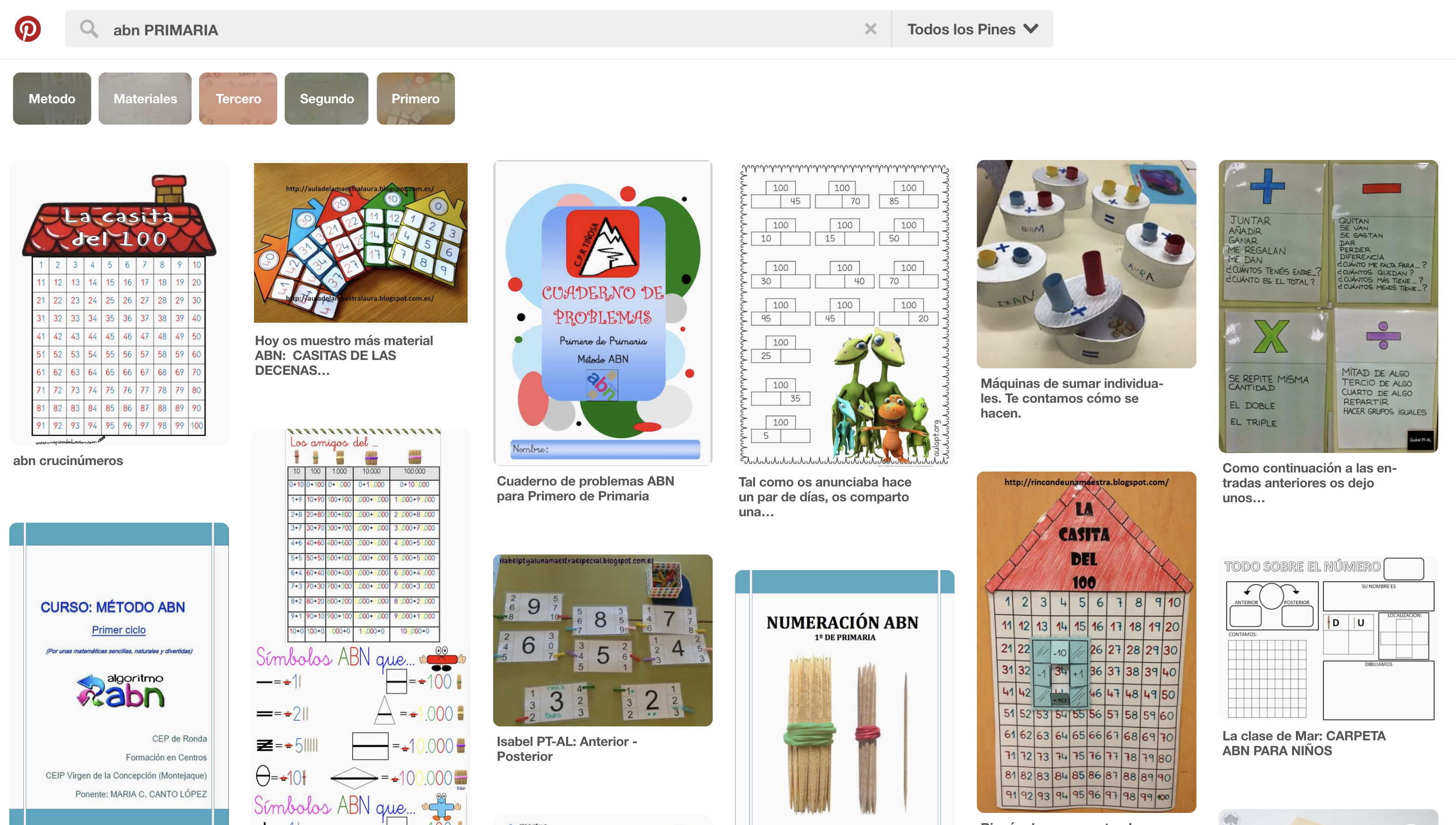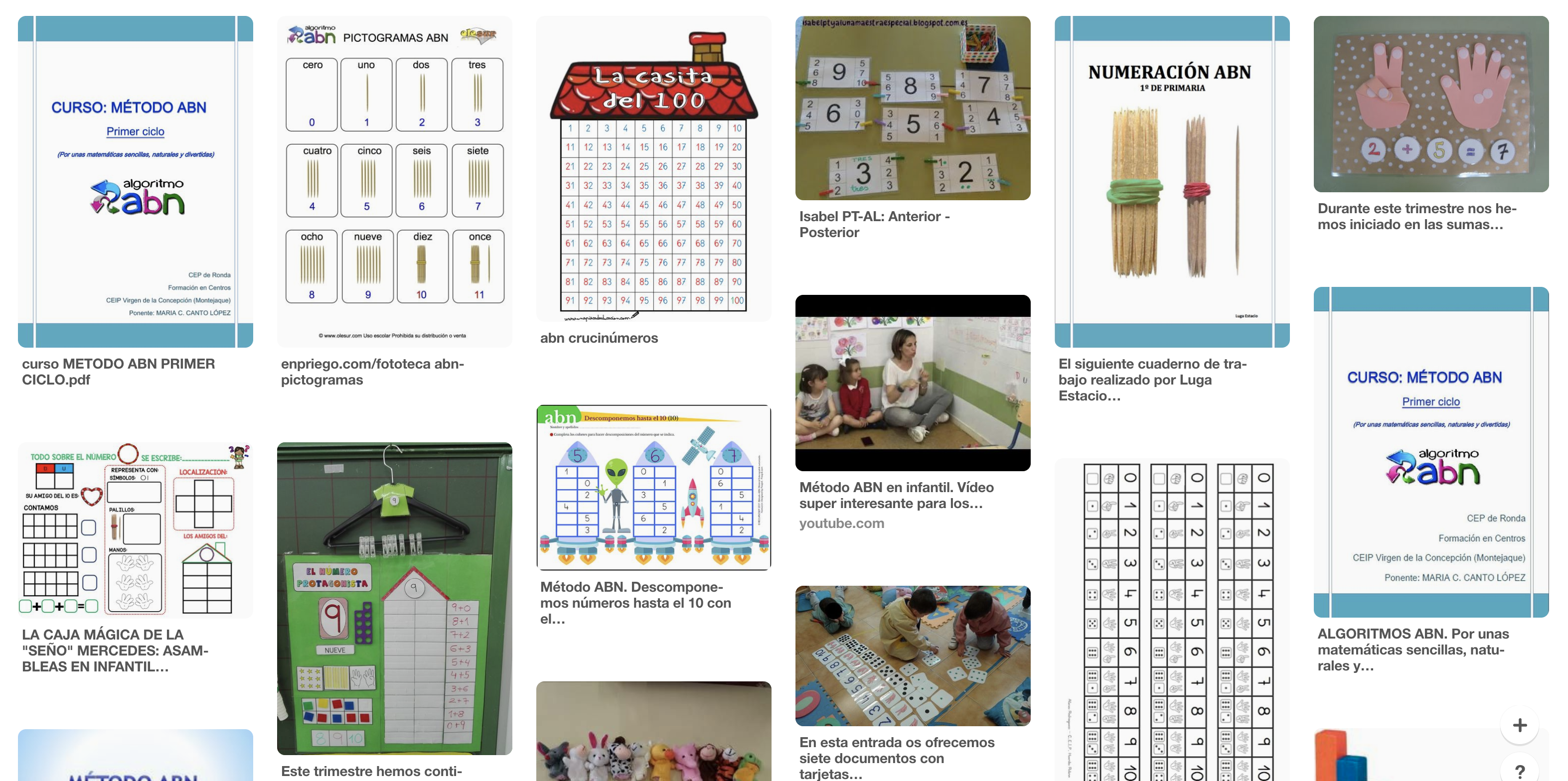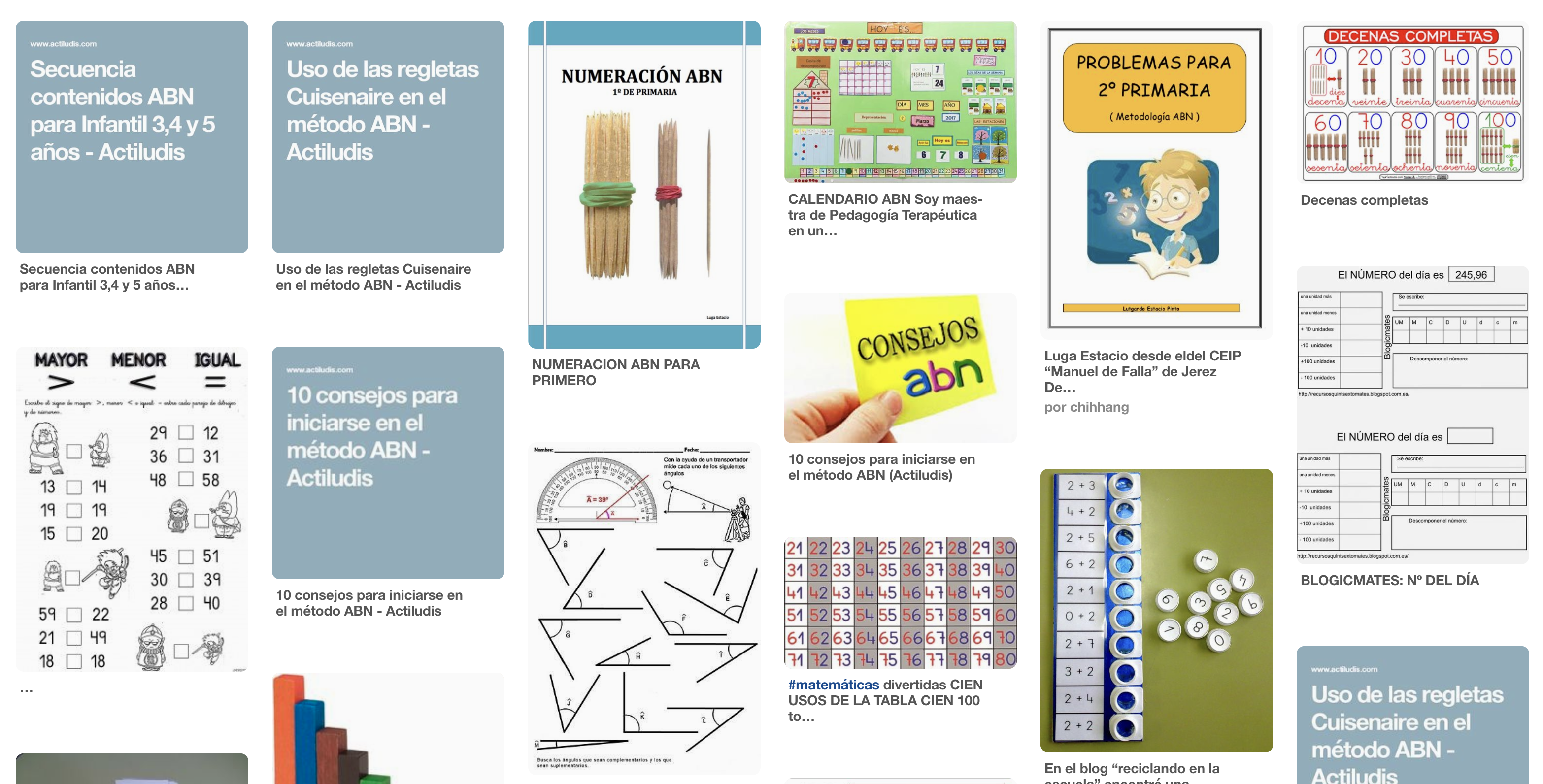 Realizamos un recopilatorio de materiales por temáticas alojados en la red social Pinterest, tanto de Educación Infantil cómo de Primaria, a partir de los cuales podremos navegar y encontrar aún más materiales útiles para el método. Recordar que para poder acceder es necesario estar registrado. Advertir que no todos los materiales que se muestran en los álbumes Pinterest son materiales adecuados para usar dentro del método ABN, ya que han sido recopilados por sus respectivos usuarios, pero muchos sí pueden usarse dentro de la metodología ABN.