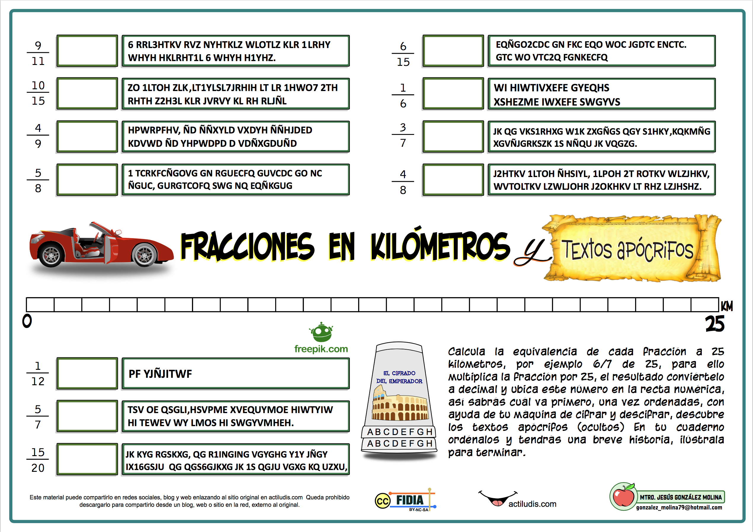En esta ficha mediante la máquina de cifrado y descifrado se trabaja el producto de fracciones y los kilómetros. Para ello se calcula la equivalencia de cada fracción a 25 kilómetros, por ejemplo 6/7 de 25, para ello multiplica la fracción por 25, el resultado conviértelo a decimal y ubica este número en la recta numérica, así sabrás cuál va primero, una vez ordenadas, con ayuda de tu máquina de cifrar y descifrar, descubre los textos apócrifos (ocultos) En tu cuaderno ordénalos y tendrás una breve historia, ilústrala para terminar.