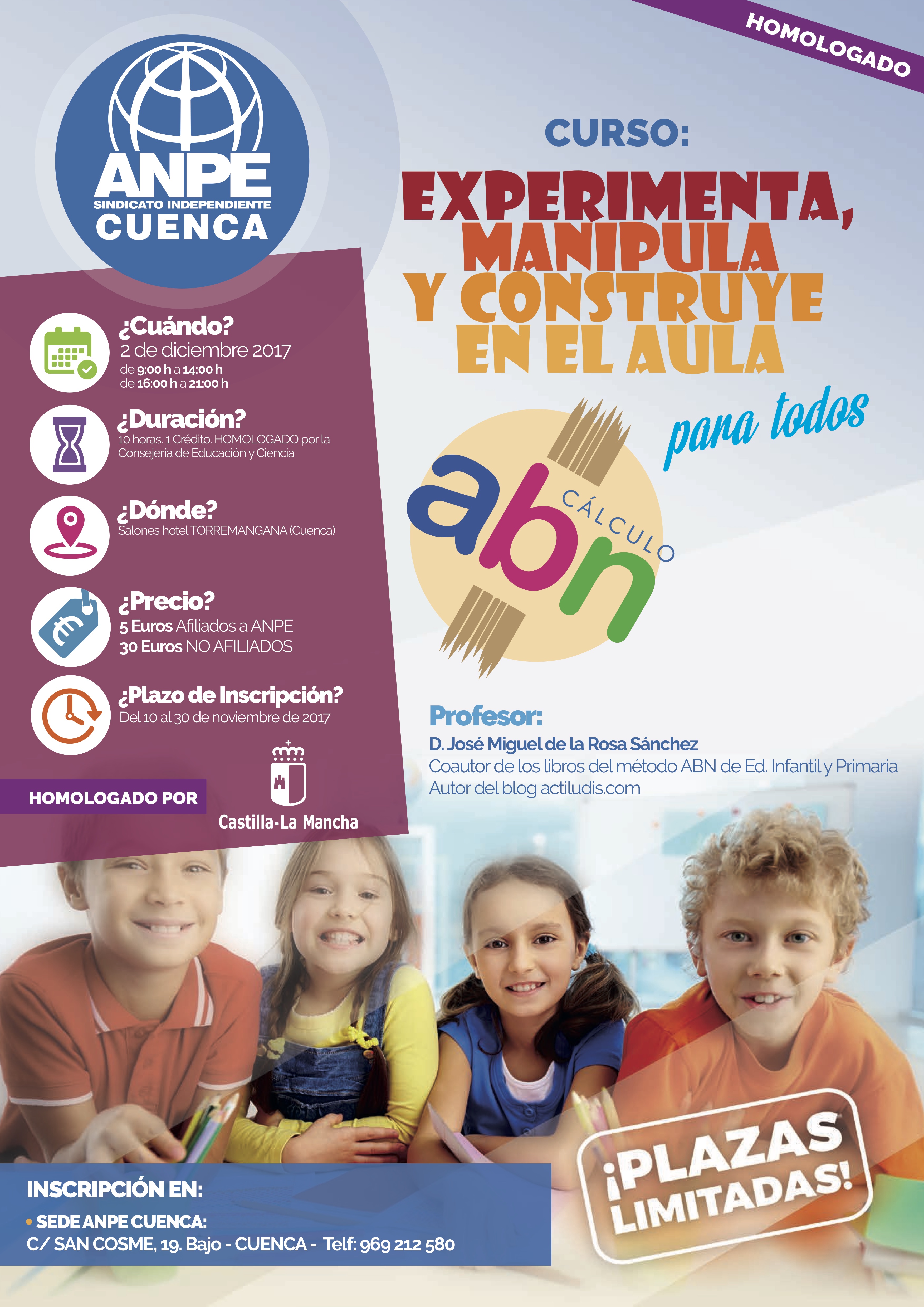 El próximo 2 de diciembre estaré en Cuenta a través del sindicato «ANPE CUENCA» que organiza el curso «Experimente, manipula y construye en el aula. ABN para todos». si quieres conocer el método ABN allí nos veremos en un horario de 9 :00 a 14:00 y de 16:00 a 21:00 en el hotel Torremangana cuya localización puedes ver en este artículo.
