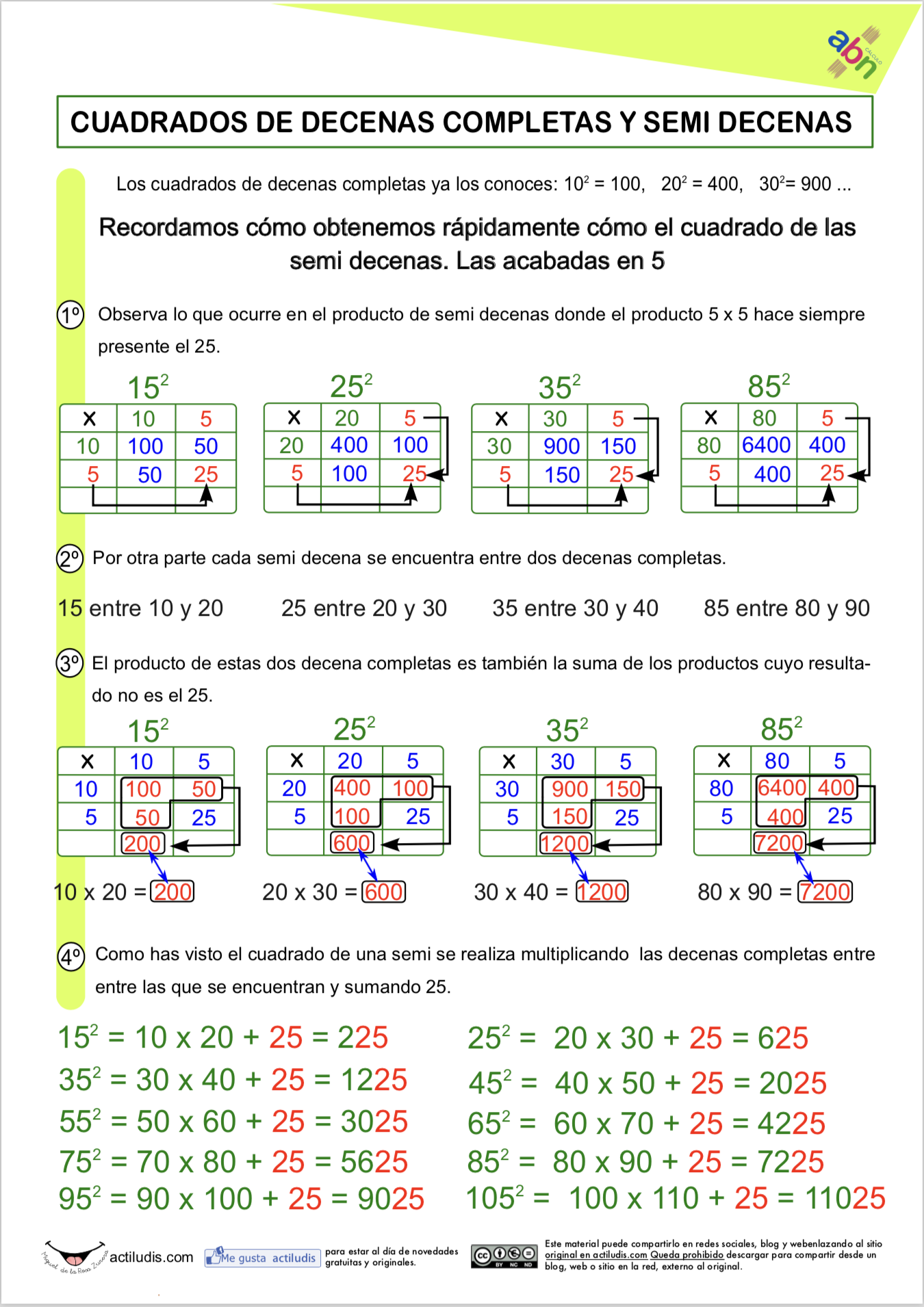 Hace un tiempo publiqué unas guías breves para las operaciones mediante el Cálculo ABN. En esta ocasión, siguiendo la misma idea, publico una guía breve para el cálculo de decenas enteras y semi decenas (para quien tenga duda a este respecto, entendemos por semi decenas los números acabados en 5, como 15, 25, 35,…) que si bien no se trata de algoritmos ABN, sí son un paso previo, junto al cálculo del cuadrado de un número al cálculo de otro mayor en una, dos, tres o cuatro unidades; al cálculo de raices cuadradas mediante el algoritmo ABN.