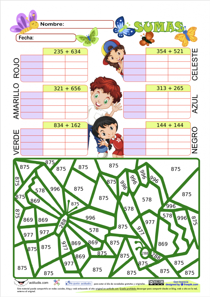 Con la siguiente actividad, ideal a partir de 1º de Primaria, podemos empezar a introducir las sumas con tres cifras ya que no se rebasa el orden de unidades, decenas ni centenas. Aunque en el método ABN no existe diferenciación a la hora de operar respecto a las llamadas «llevadas» en el método tradicional, sin embargo es un paso sencillo que permite al alumnado adaptarse a números más elevados, viendo que el proceso es el mismo que han realizado hasta el momento.