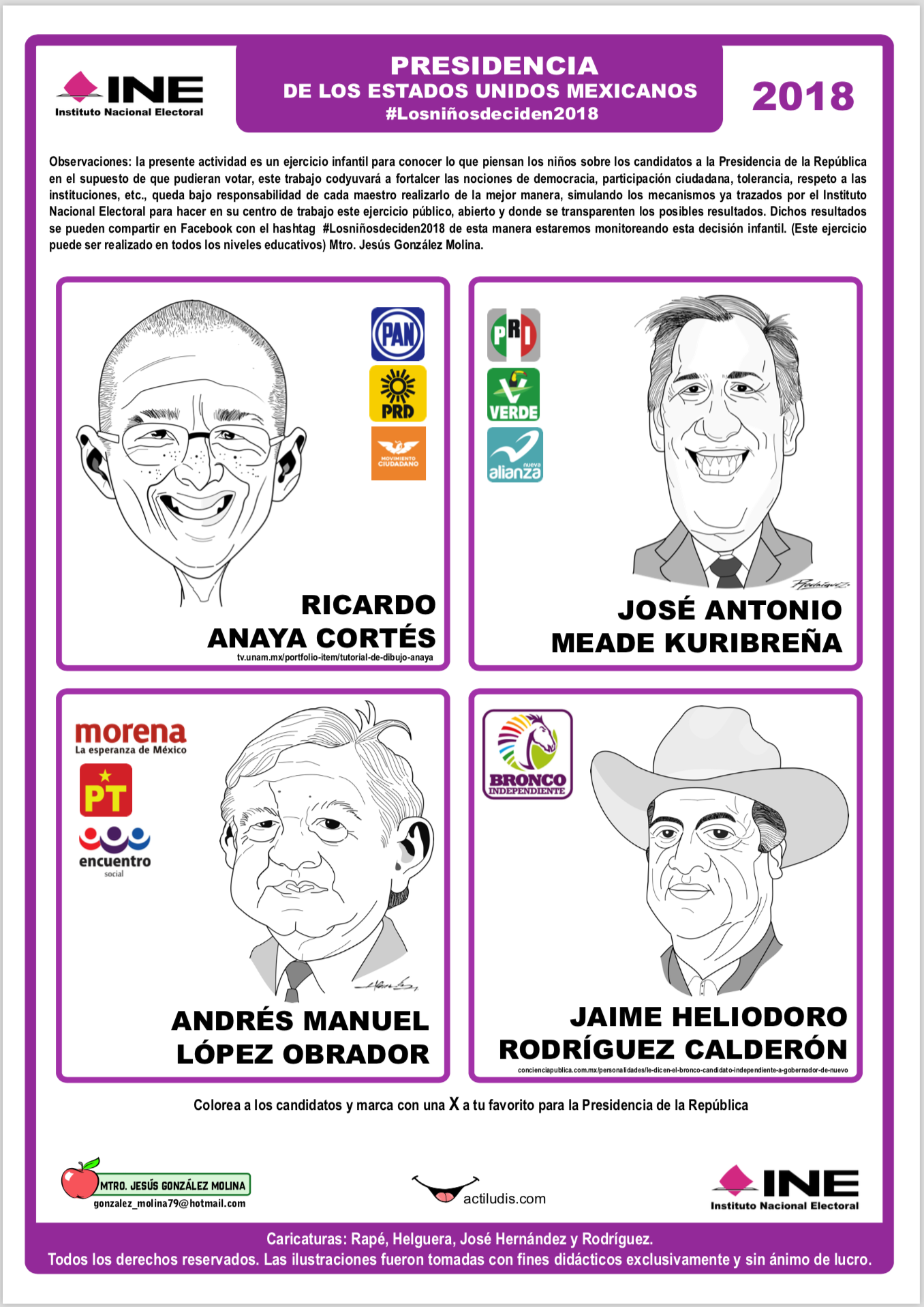 Queda bajo responsabilidad de cada maestro realizarlo de la mejor manera, simulando los mecanismos ya trazados por el Instituto Nacional Electoral para hacer en su centro de trabajo este ejercicio público, abierto y donde se transparenten los posibles resultados. Dichos resultados se pueden compartir en Facebook con el hashtag #Losniñosdeciden2018 de esta manera estaremos monitoreando esta decisión infantil. (Este ejercicio puede ser realizado en todos los niveles educativos)