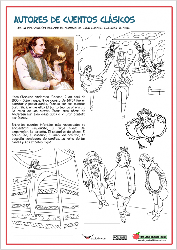 Para ello se les propone que lean la información que se les ofrece, identifiquen y pongan el título al cuento que se representa mediante el dibujo y que lo coloreen al final. Además se les puede pedir que amplíen la información buscando en internet más datos sobre el autor y sobre alguna de sus obras.