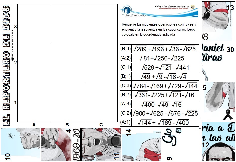 Resuelve las siguientes operaciones con raíces cuadradas. En el lateral de la ficha encontrarás las soluciones. Recorta y pega en la coordenadas que te indican y compondrás la imagen del puzzle que se ha creado para que sea más divertido.