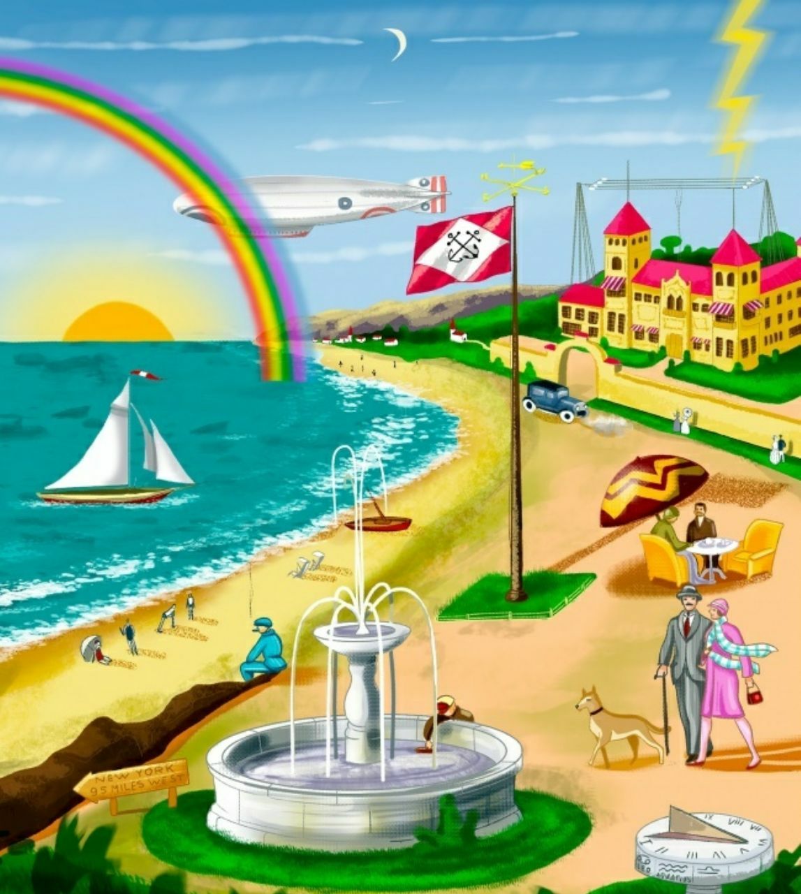 - El cartel, de la esquina inferior izquierda, indica que Nueva York está en el oeste, mientras que la flecha de la veleta de viento sobre la bandera indica esa misma dirección como al norte.