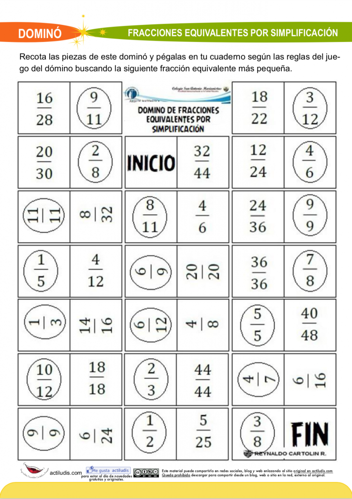 Esta actividad consiste, que a través del juego del dominó, ordenar las fracciones que se presentan buscando una fracción equivalente simplificada. Para ello se pide al alumnado que recorte las piezas del dominó y las pegue ordenadas, según el juego y las premisas establecidas. Al final está las explicación con las dos primeras fichas colocadas.