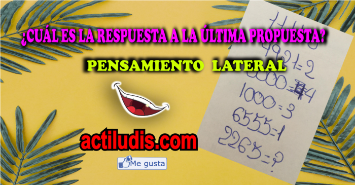 Tu estás aquí: Inicio › ¿Cuál es la respuesta a la última propuesta? › PENSAMIENTO LATERAL PENSAMIENTO LATERAL Deja una respuestaTu dirección de correo electrónico no será publicada. Los campos obligatorios están marcados con *Comentario * Nombre * Correo electrónico * Web Recibir un correo electrónico con cada nueva entrada. Δ