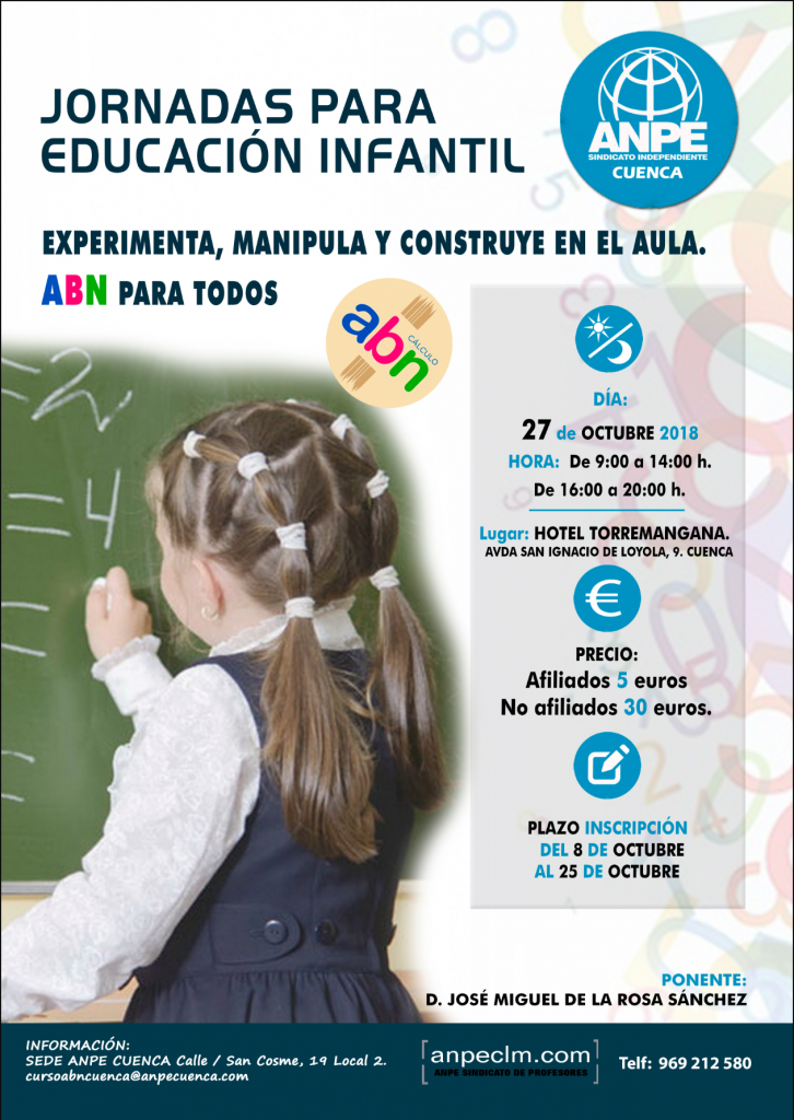 El próximo 27 de octubre estaré en Cuenta a través del sindicato «ANPE CUENCA» que organiza el curso «Experimente, manipula y construye en el aula. ABN para todos». si quieres conocer el método ABN en Educación Infantil, allí nos veremos en un horario de 9 :00 a 14:00 y de 16:00 a 20:00 en el hotel Torremangana cuya localización puedes ver en este artículo.