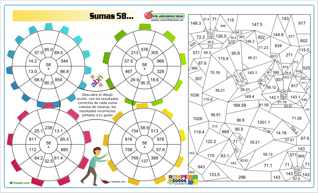 Cuatro ruedas de sumas con diez operaciones cada una en las cuales sumar el número 58 a otros sumandos con tres cifras o con decimales. Una vez realizado se pide descubrir el dibujo oculto, con los resultados correctos de cada suma, coloreando de naranja, los resultados incorrectos, que son el fondo del dibujo, píntandolos al gusto