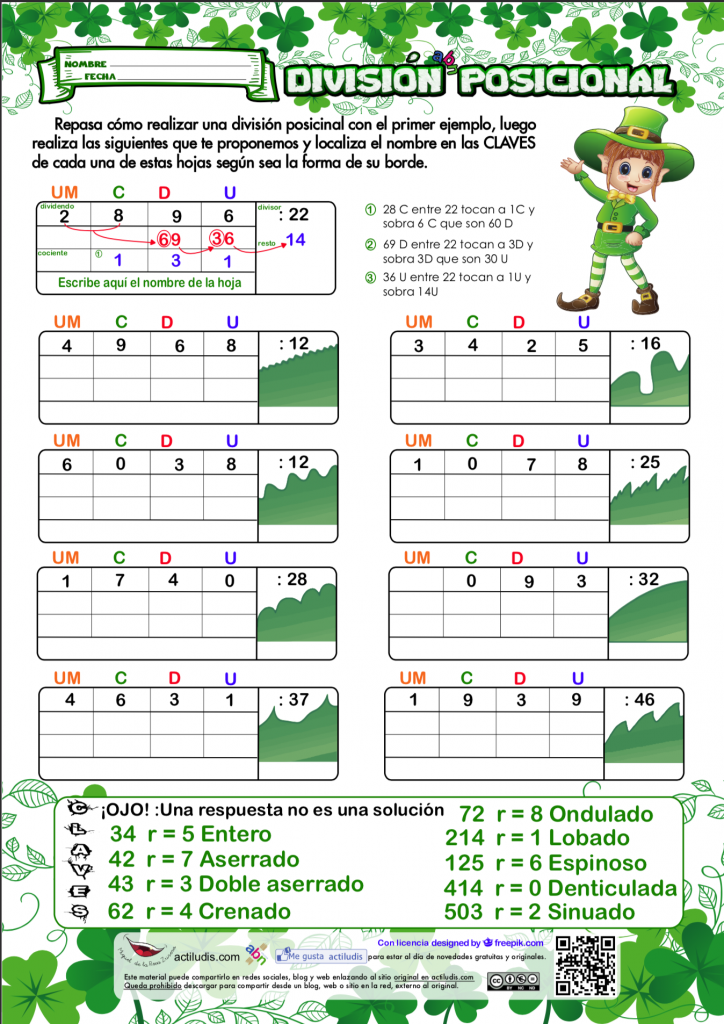 En estas dos propuestas de actividades hemos usado como ejemplos para practicar cantidades entre tres y cuatro cifras en el dividendo y una o dos en el divisor. Así mismo hemos realizado un video tutorial explicando el proceso con las dos operaciones que encabezan las actividades.