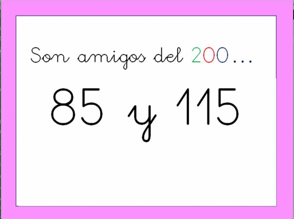 Todos los días comienza las clases de Matemáticas con un ratito de cálculo mental y las fichas para proyectar en la pizarra digital le resultan muy prácticas, así que ha hecho una serie de ficheros, en cada uno de ellos se trabaja los amigos de un número (10, 20, 30, 40…hasta 100) y 0tro grupo para 100, 200 y 300 en tres niveles diferentes. En cada fichero está recogida cada modalidad con todas las opciones que pueden darse de ese número, una pàgina con la pregunta y la siguiente con la solución. Los amigos del 100, 200 y 300 tienen tres niveles de dificultad (nivel 1: termina en 0, nivel 2: termina en 0 o en 5 y nivel 3: todos los números).