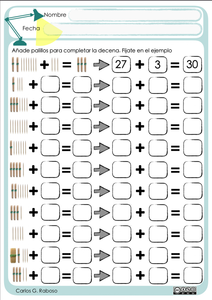 En la actividad se muestra primero la representación simbólica mediante palillos y a continuación su representación numérica tanto de la cantidad inicial, del complementario y del resultado final.